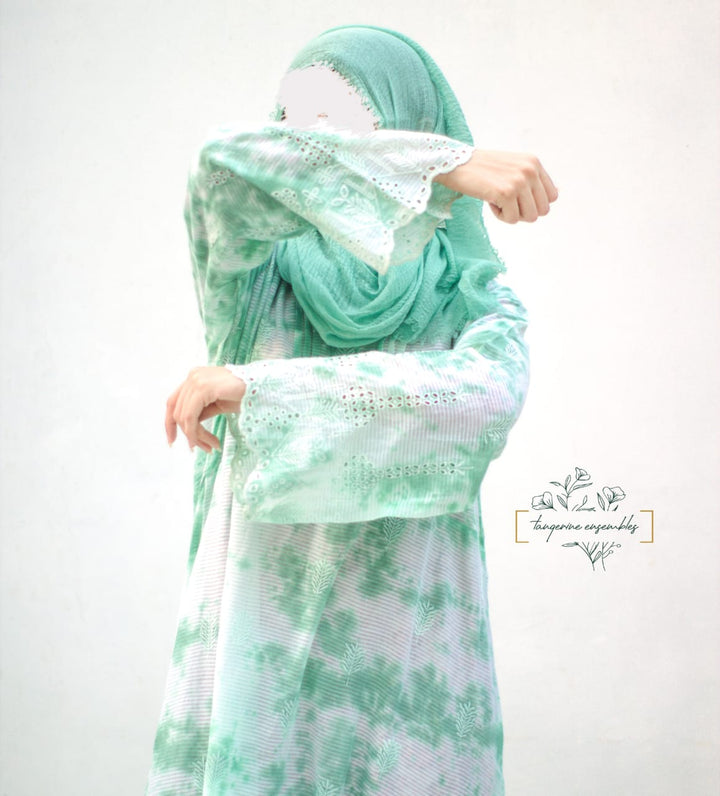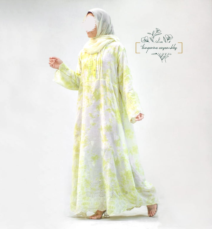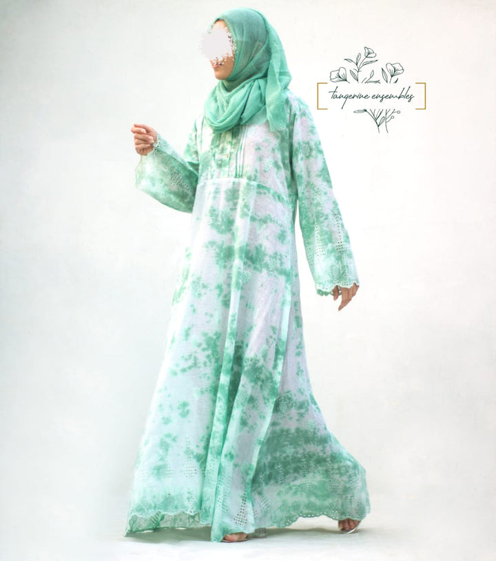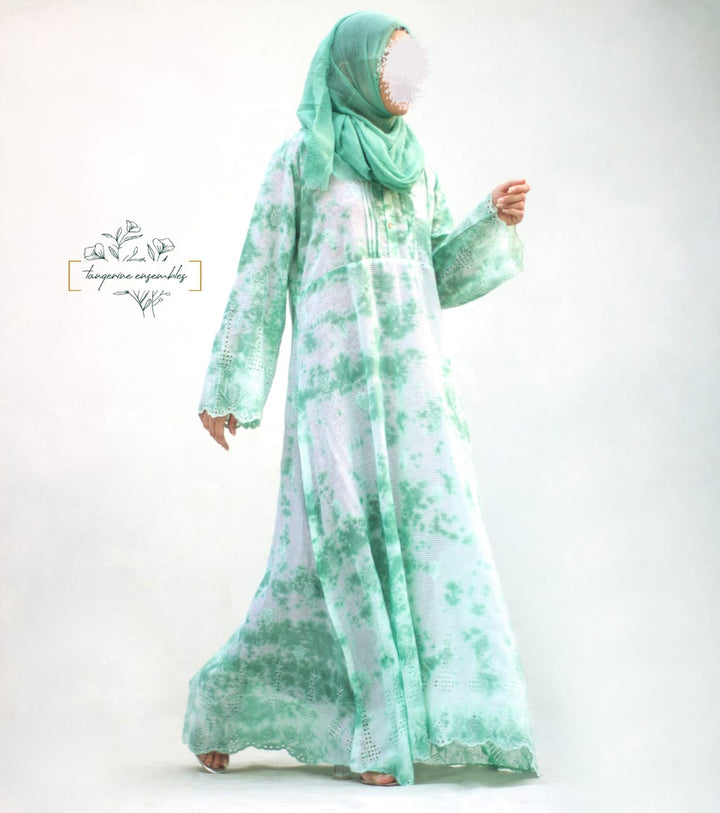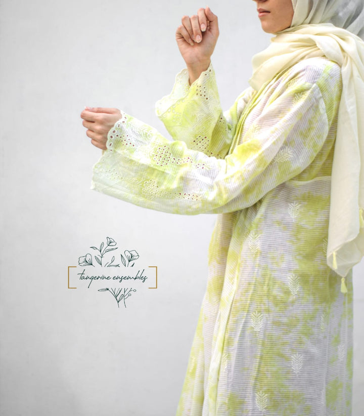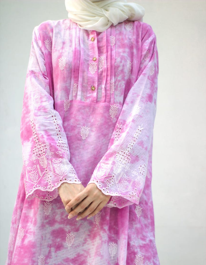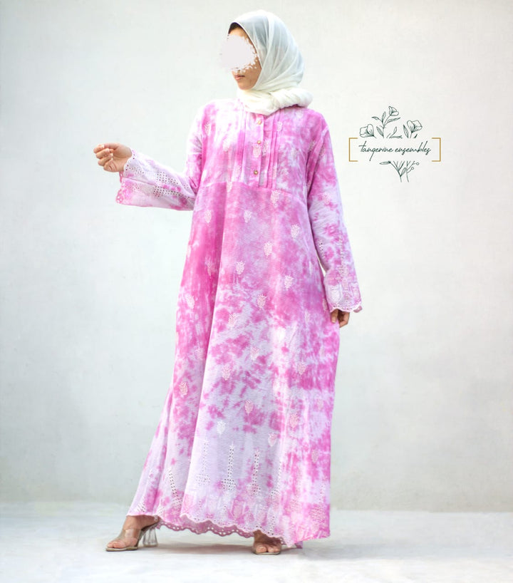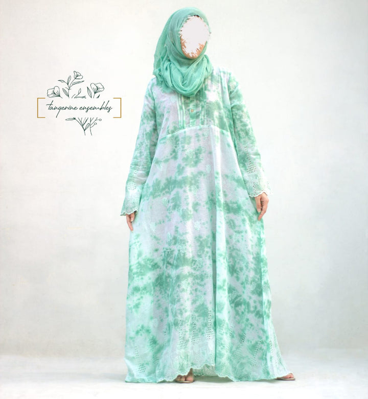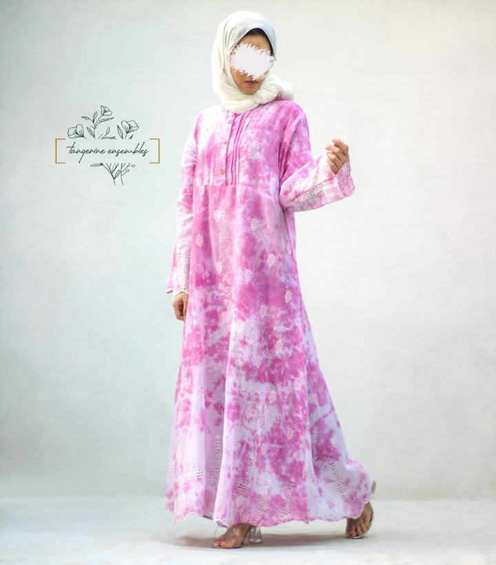 Introducing our lawn tie-and-dye abayas – lightweight, breathable, and perfect for summer. Adorned with chikankari borders, all-over embroidered motifs, pleated buttoned front bodice and Aline shape for a flattering fall. The self-textured lawn fabric offers all-day comfort, making it ideal for travel and everyday wear. The tie-and-dye shades add a vibrant, trendy touch to your modest wardrobe.