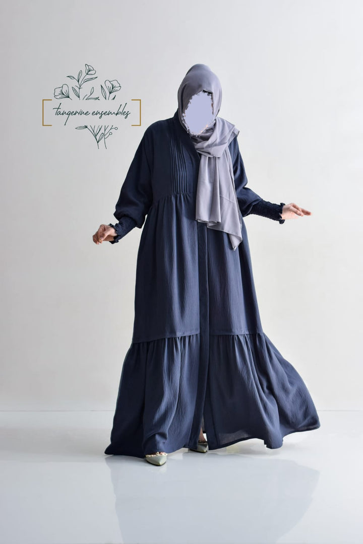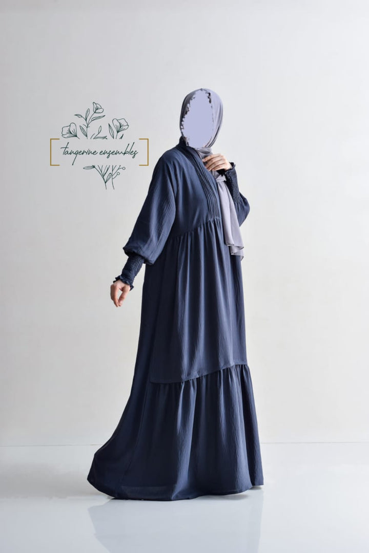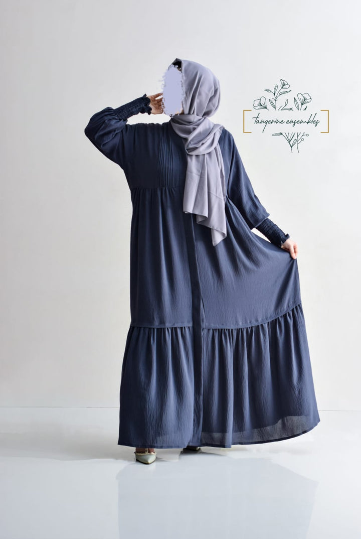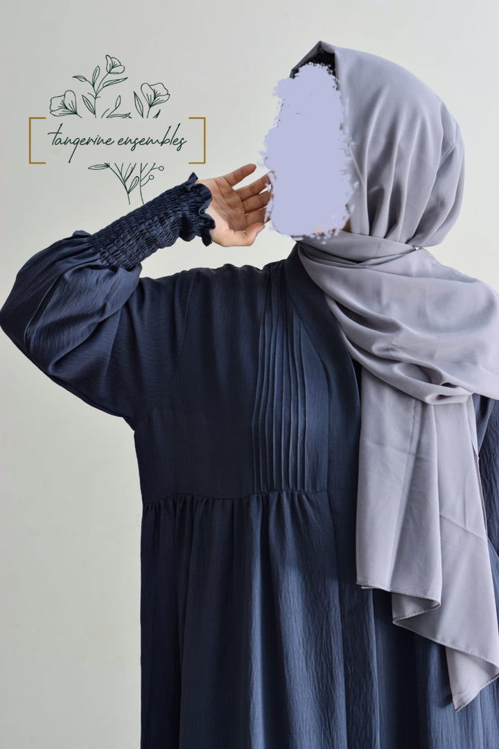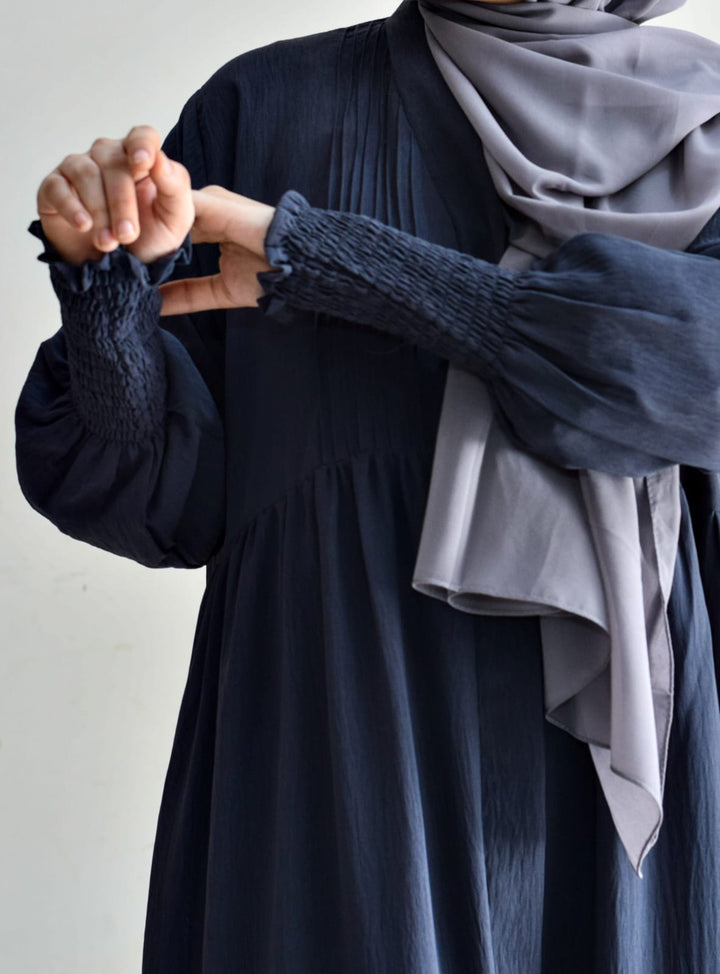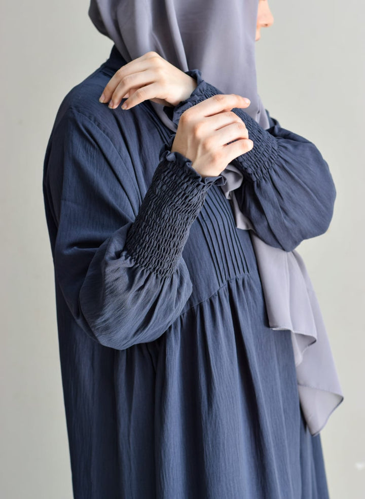 Refined and graceful, this solid grey abaya features a pleated bodice with a flattering flare and gathered details. The smocked sleeves add a stylish touch, while the lightweight, soft fabric makes it ideal for daily elegance.