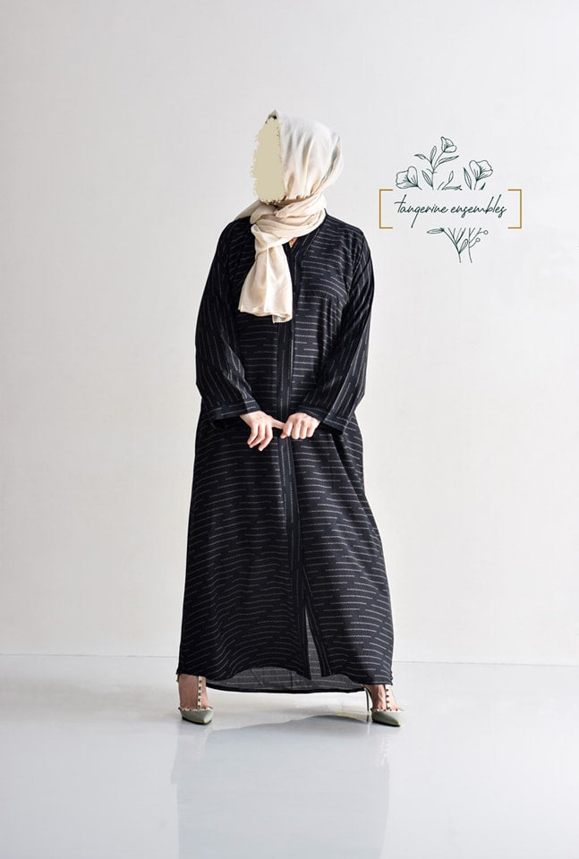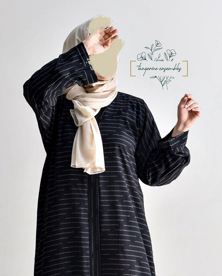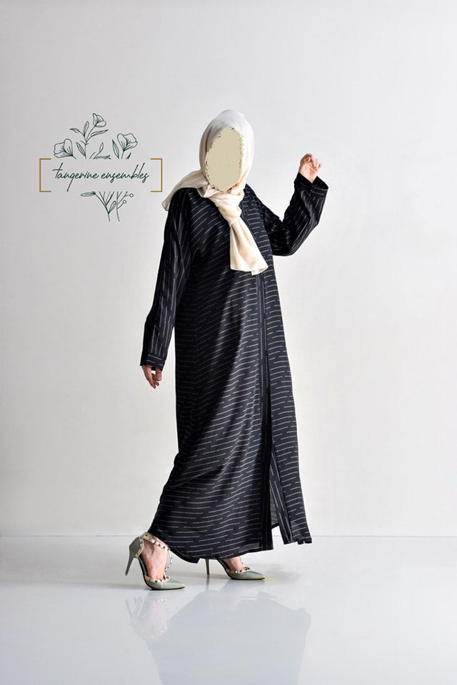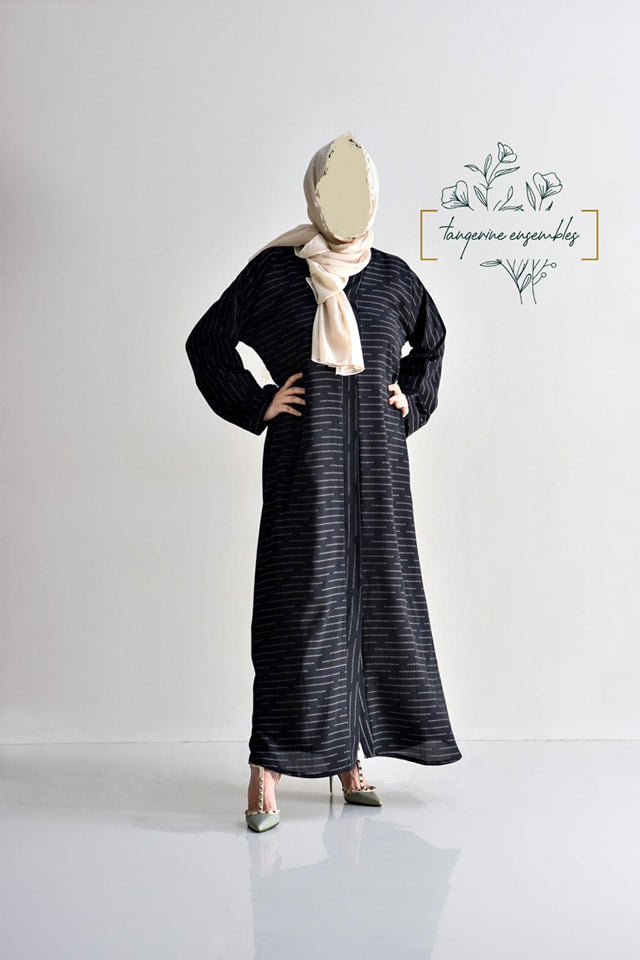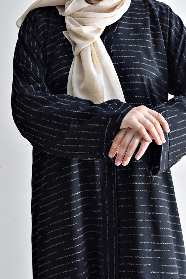 For those who love understated elegance, this black abaya with a sleek stripe print in soft Malai Georgette offers the perfect balance of comfort and style.