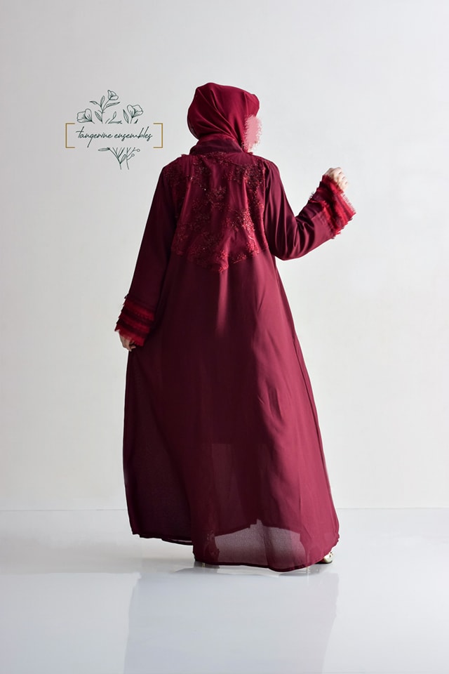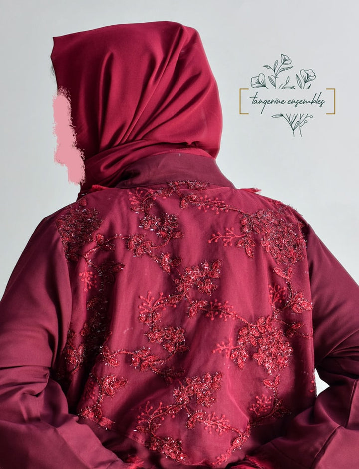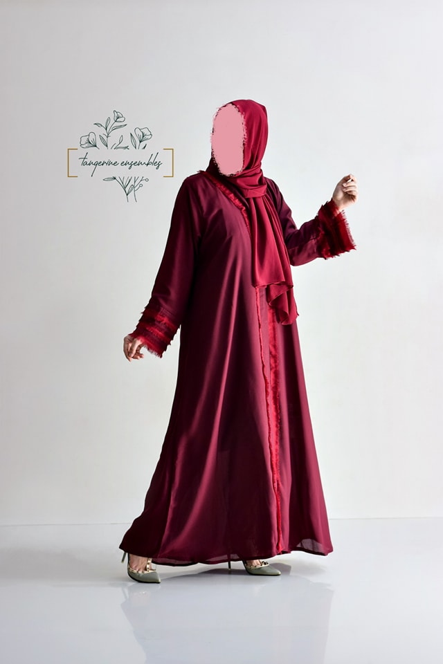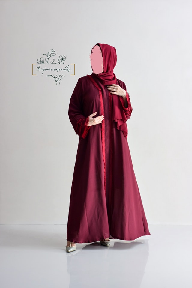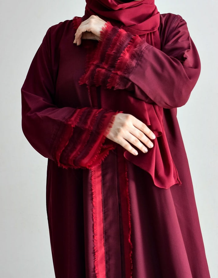 Make a statement at formal gatherings with this stunning burgundy abaya. Featuring eye-catching fringed sleeves in contrasting color and front detailing, it’s elevated by an embroidered net back bodice for an extra touch of elegance.
