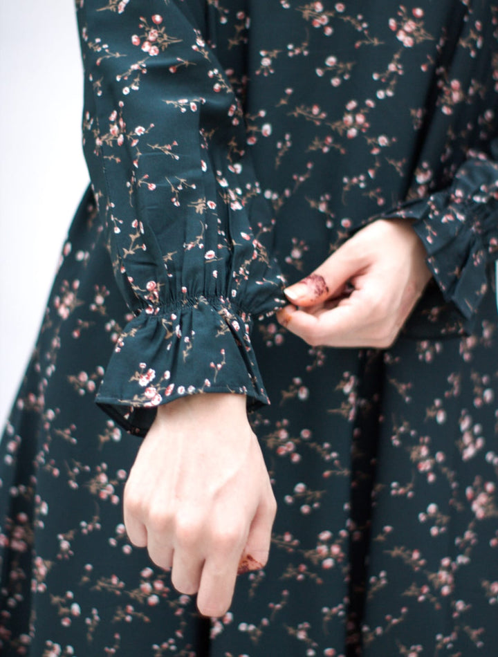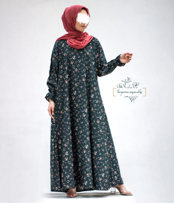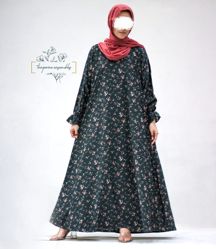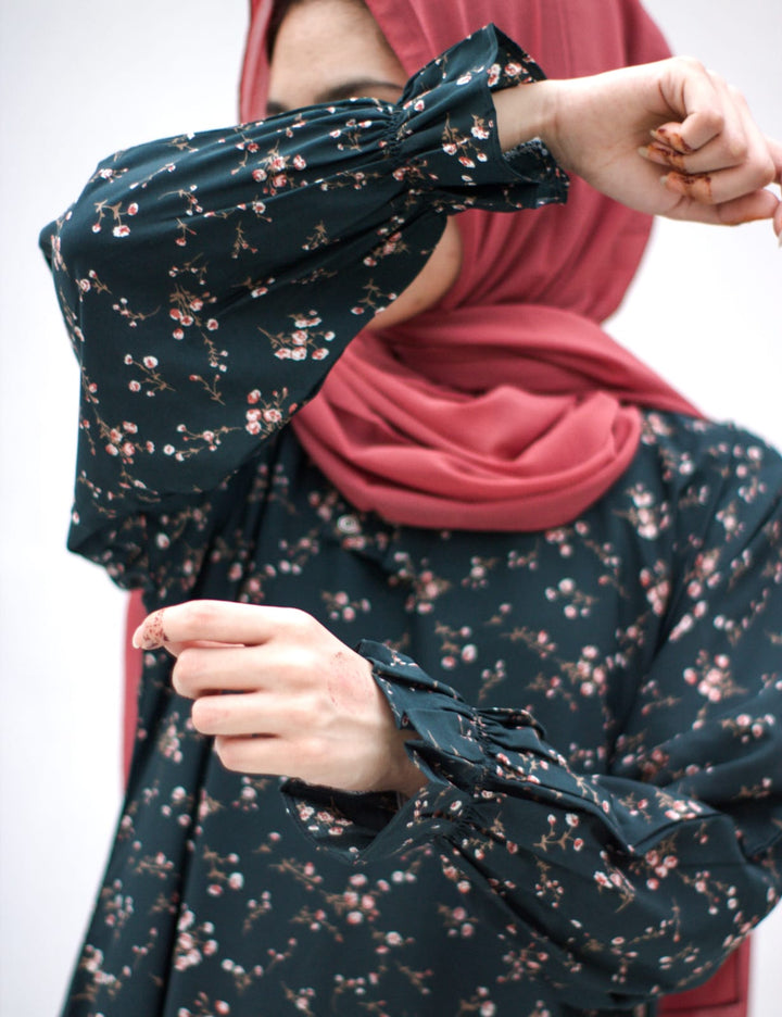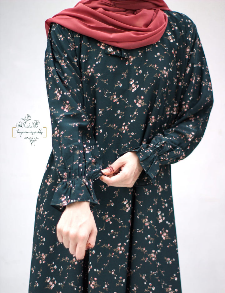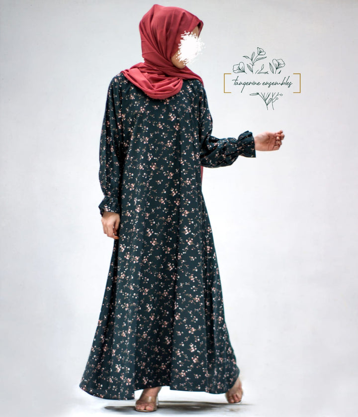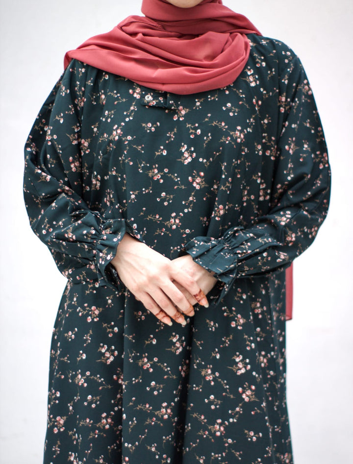 This minimal yet charming floral maxi in a gorgeous green tone is designed for comfort and style. Featuring smocking sleeves for a feminine touch, and stitched from airy, breathable fabric, it's your go-to for warm days. Styled with a coral hijab to enhance the overall look with contrast.