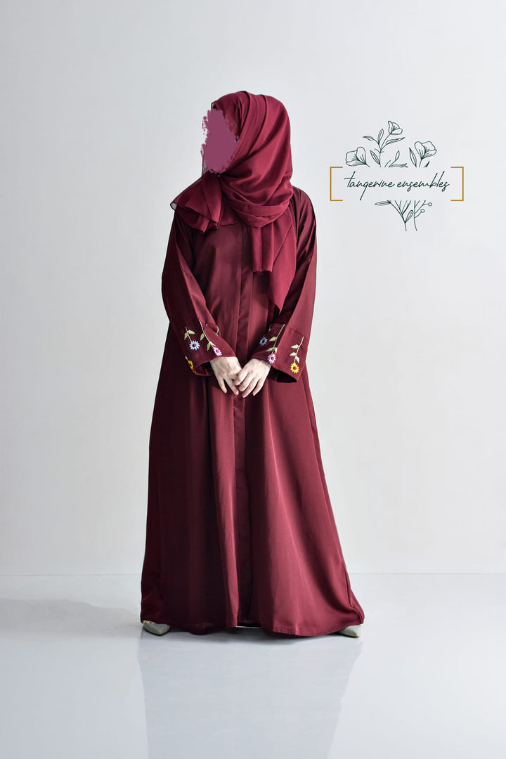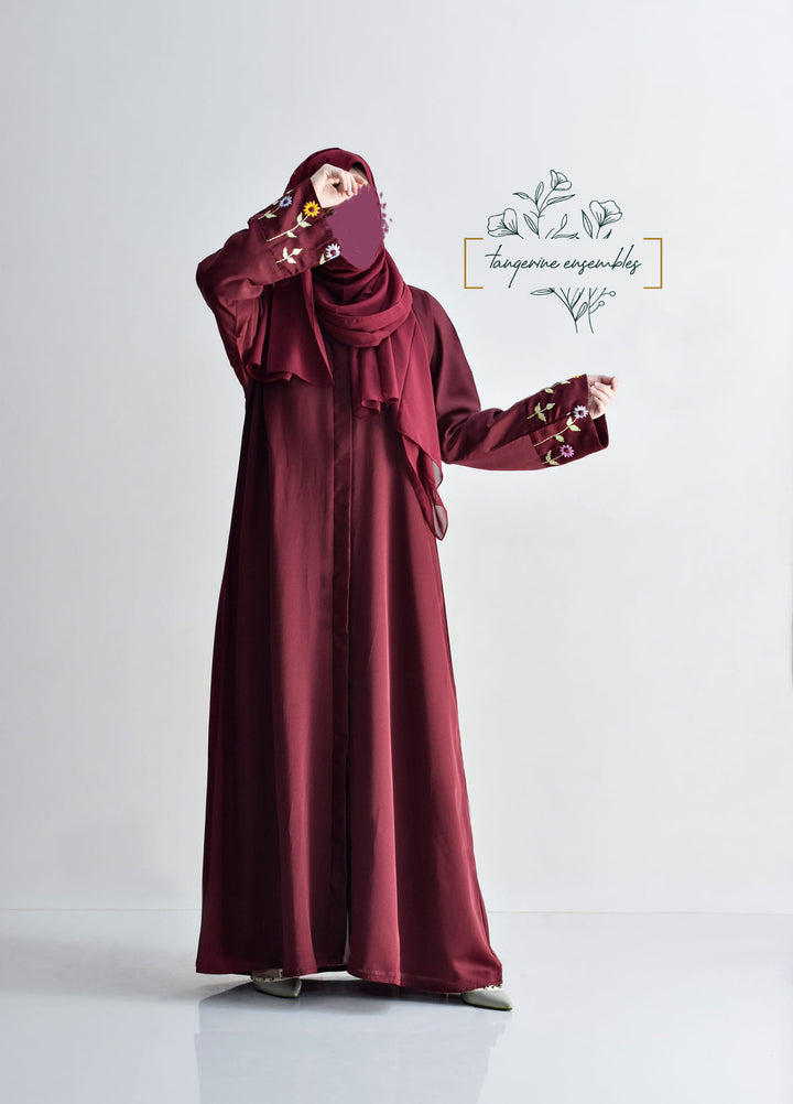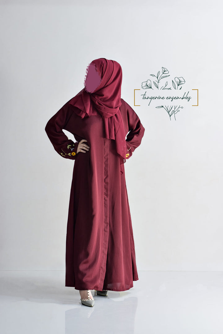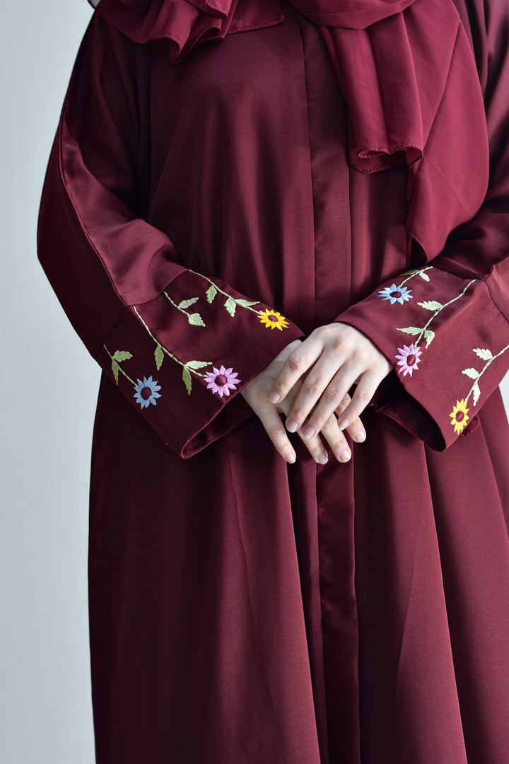 blend of elegance and uniqueness, this burgundy abaya with embroidered floral sleeves adds a pop of color to a classic look. The plain design enhances the striking details, making you stand out beautifully.
