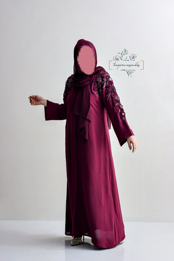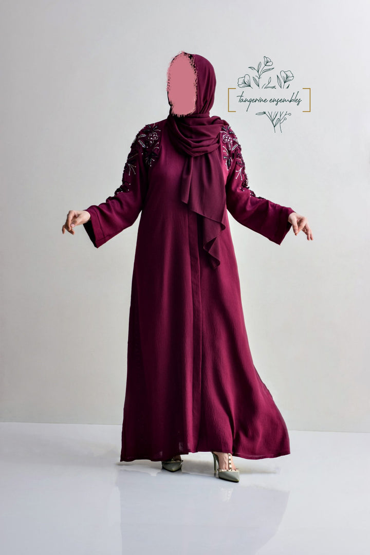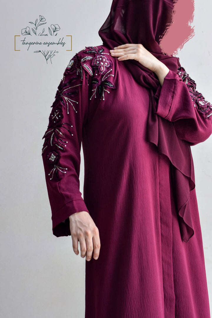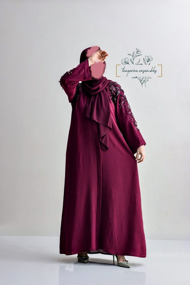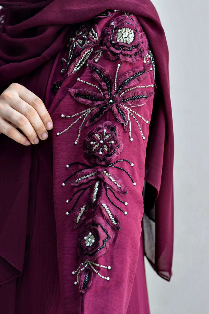 Indulge in luxury with our 3D embroidered abaya. The intricate sleeve embroidery and airy, textured fabric make it the perfect fusion of comfort and elegance.