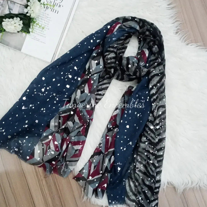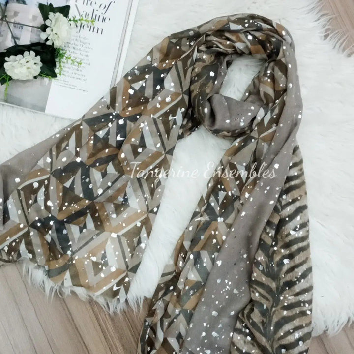 A statement-making viscose hijab featuring a unique fusion of abstract print with bold leopard print, accented with delicate foil stamps. Soft, breathable, and stylish, this hijab blends contemporary fashion with timeless elegance , perfect for both casual and festive looks.