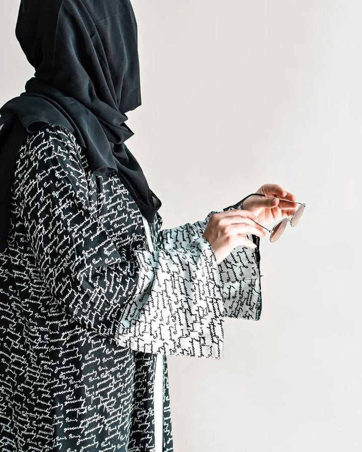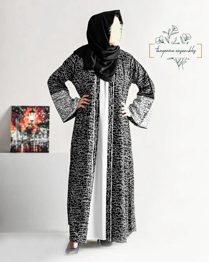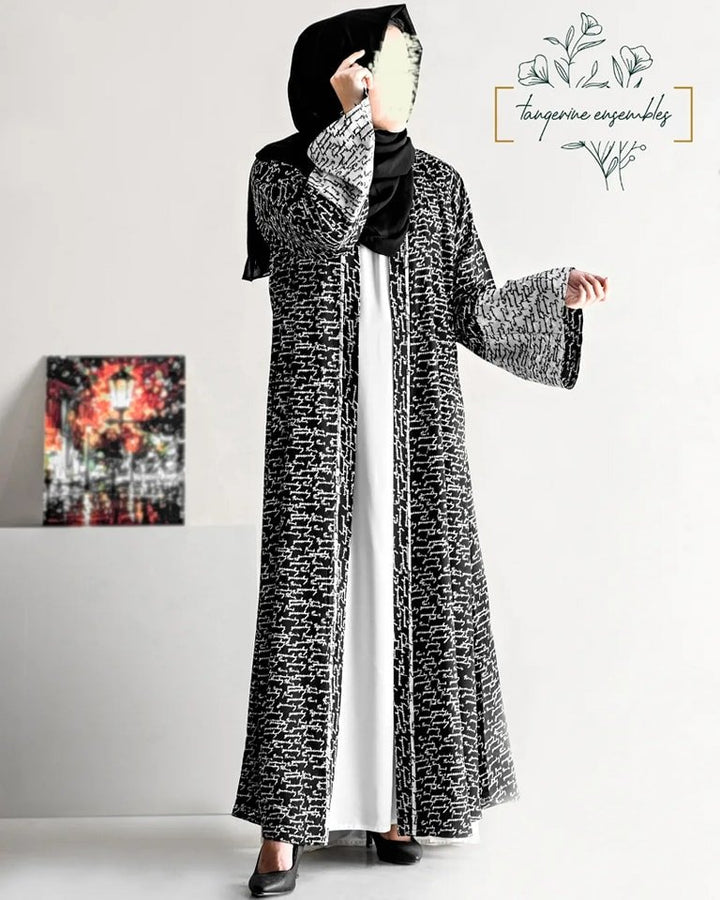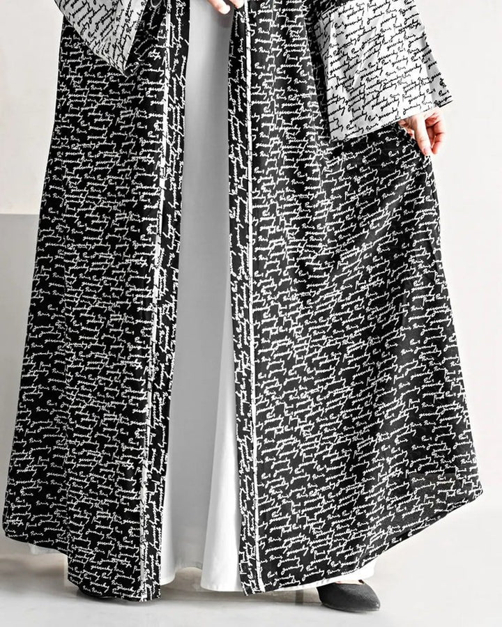 Light as air, bold in style: Unveil grace with a black and white text print abaya in breathable Georgette.