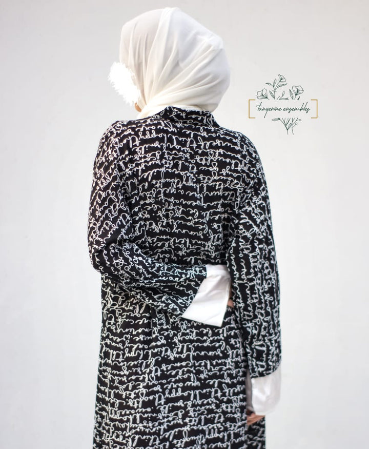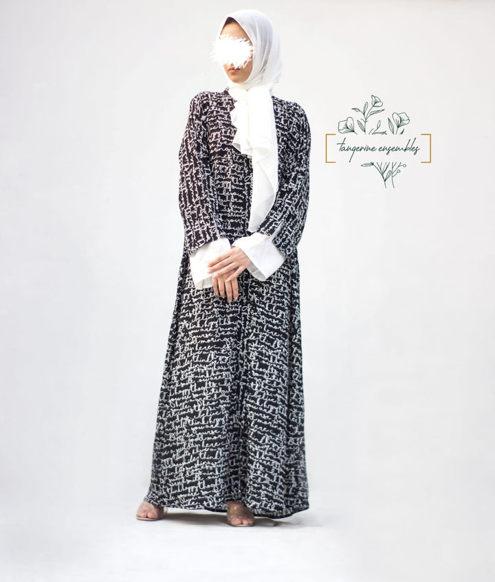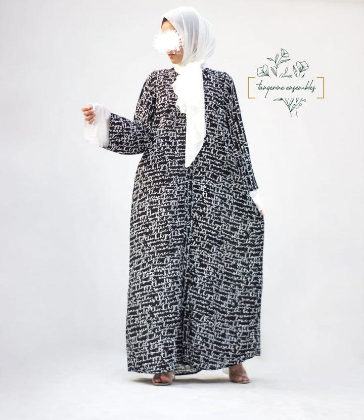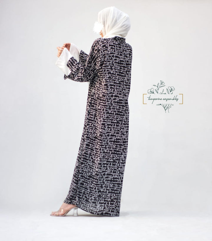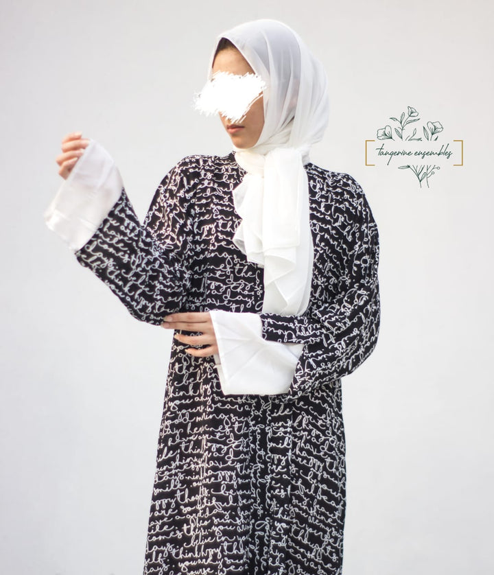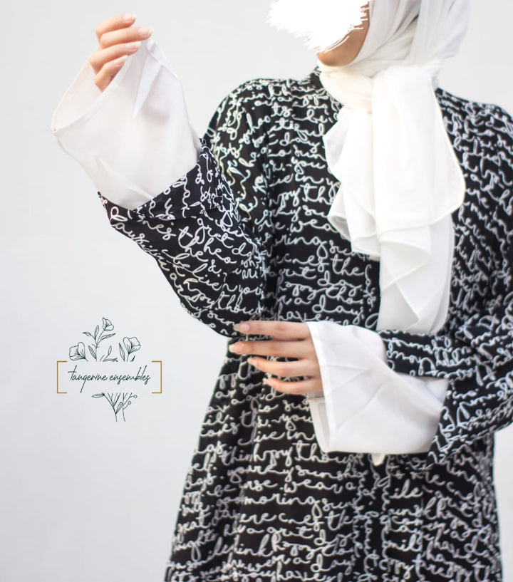 Chic Georgette Abaya with a stylish alphabetic print and white-accented sleeves. Crafted from lightweight, breathable fabric for all-day ease.