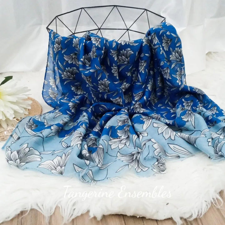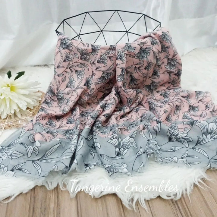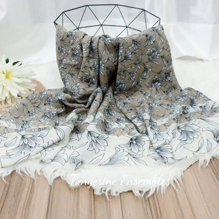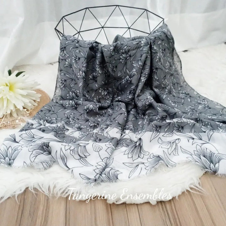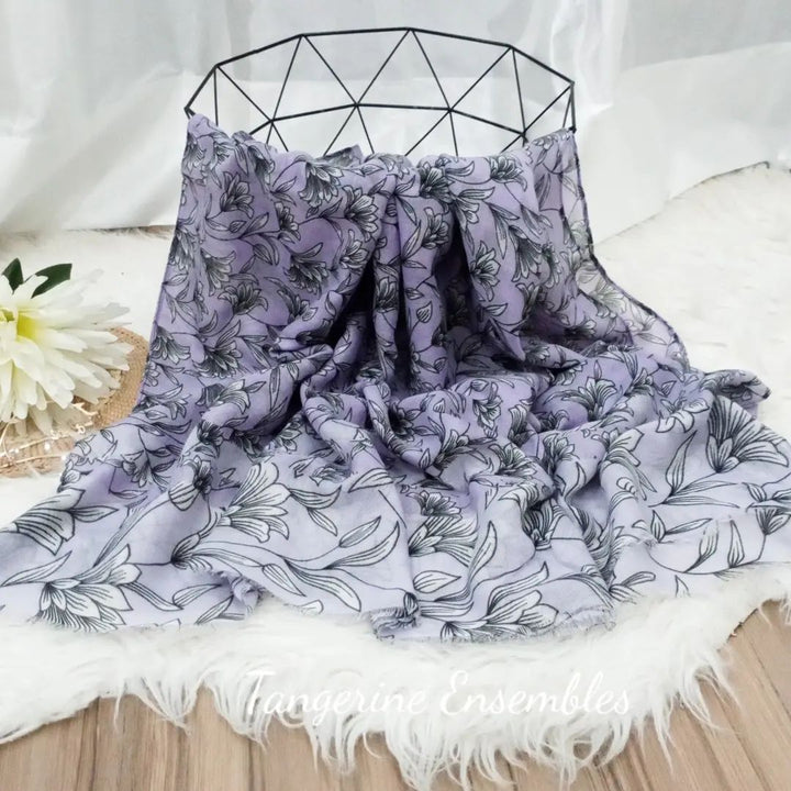A soft lilac viscose hijab with delicate floral print in black and grey tones. Lightweight, breathable, and perfect for all-day wear. The elegant floral pattern adds a feminine touch, making it suitable for both casual and formal looks.