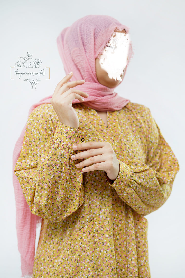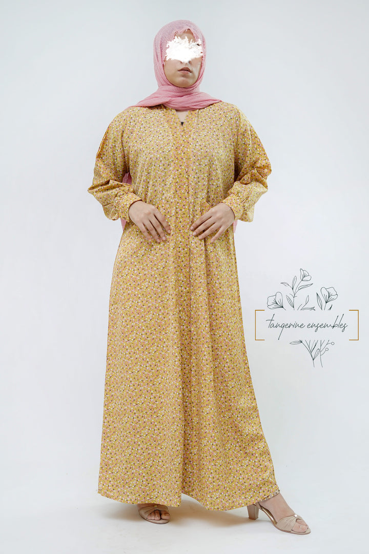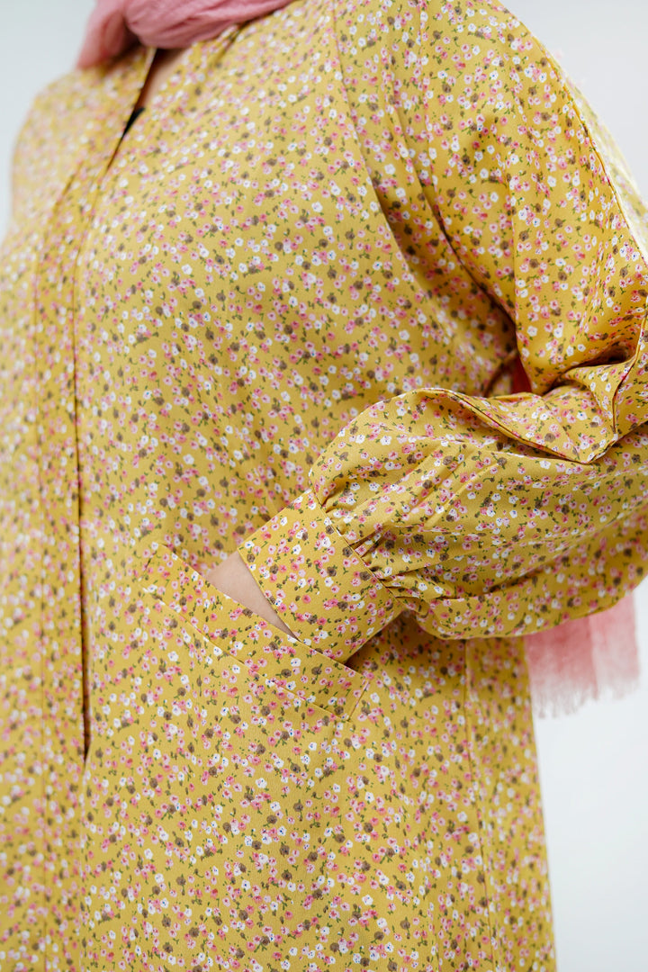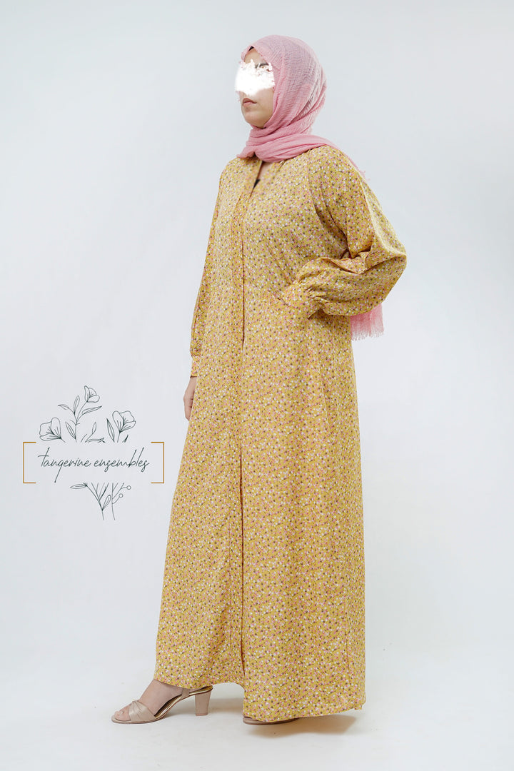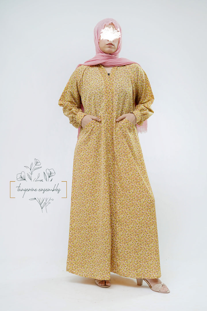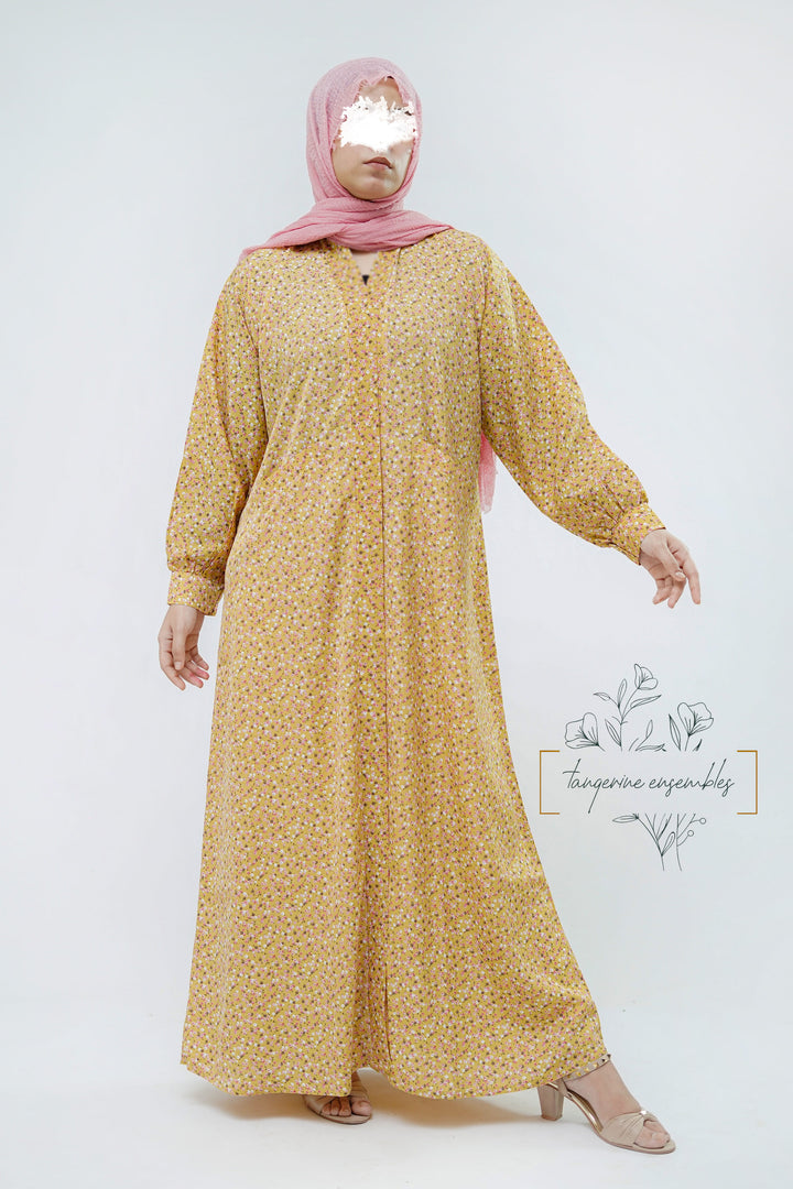 This yellow floral abaya is perfect for everyday wear — vibrant yet modest, with comfortable cuffs, front pockets, and breathable fabric to keep you glowing all day.