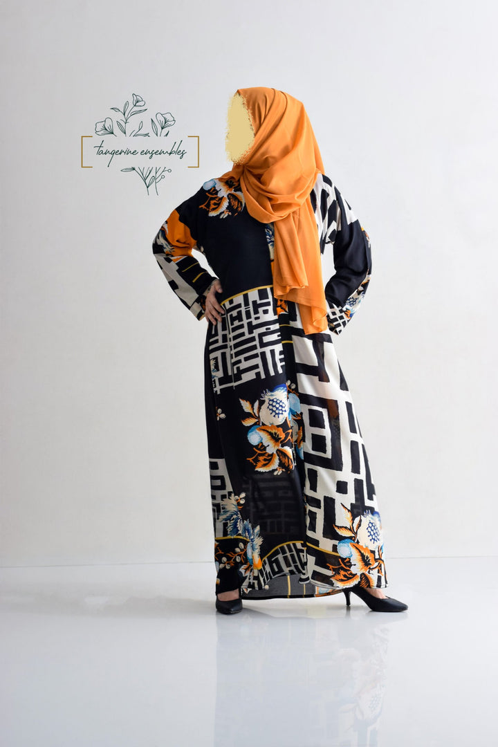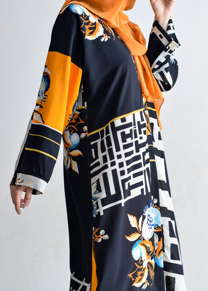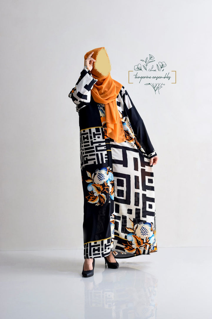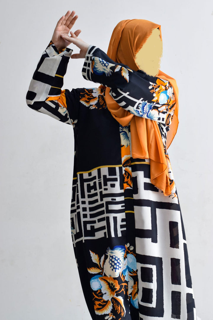 Elevate your daily look with this black abaya, featuring an artistic abstract print and a hint of yellow. A minimalist design that stands out effortlessly.