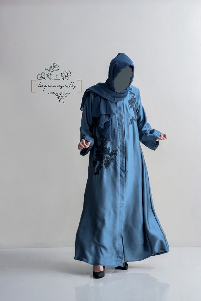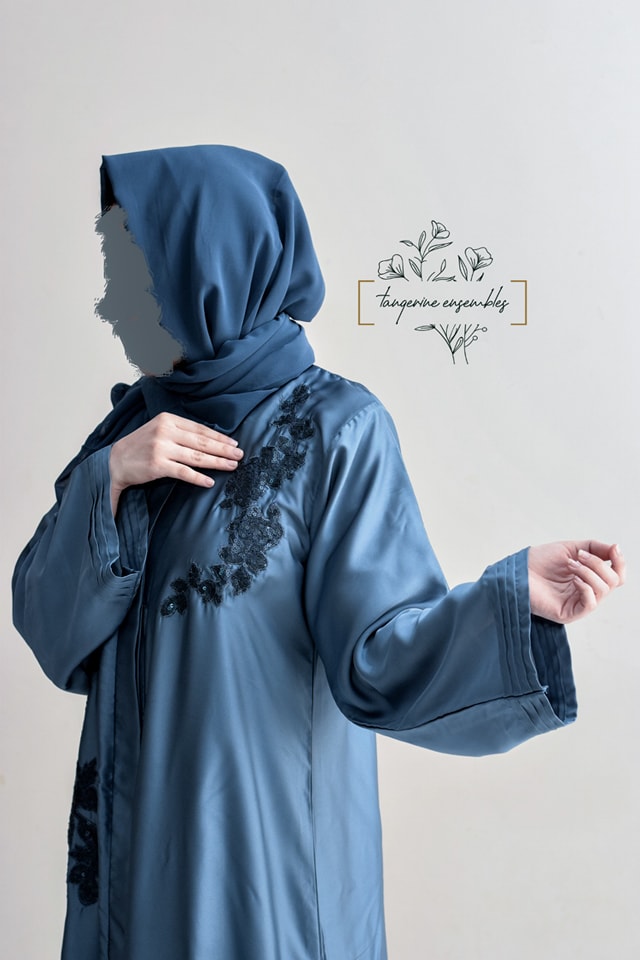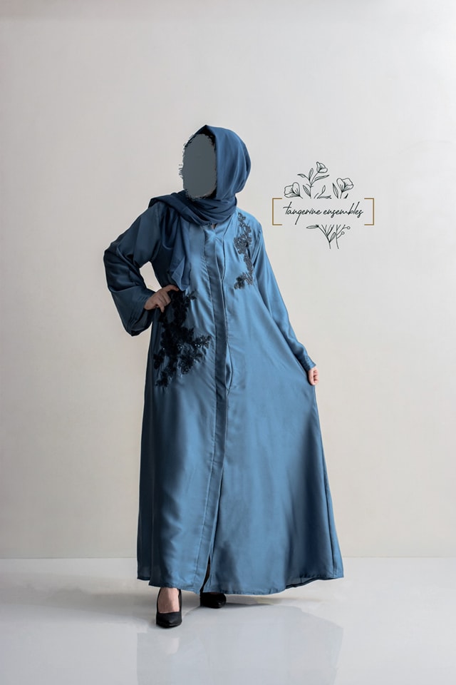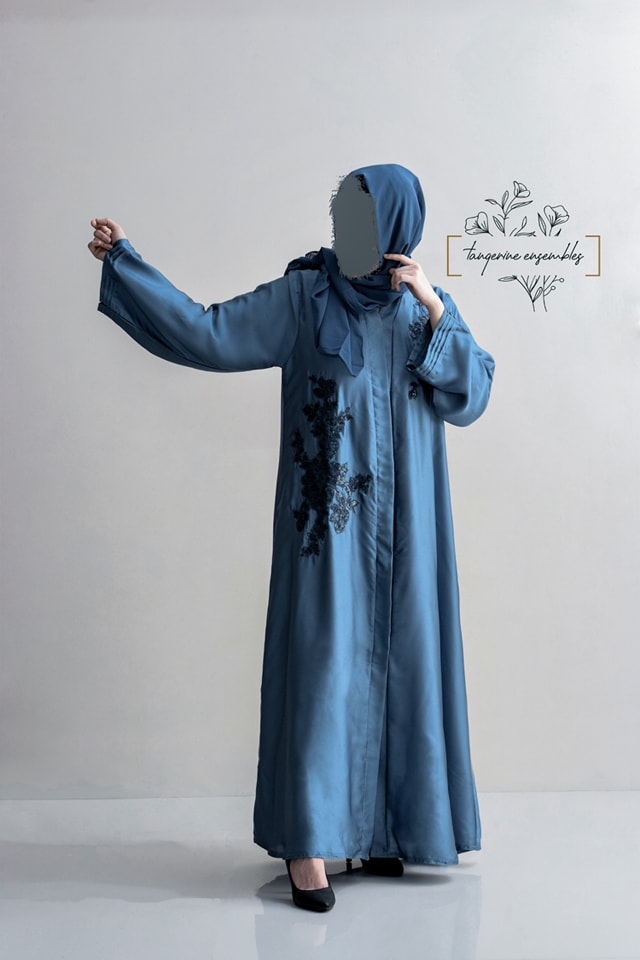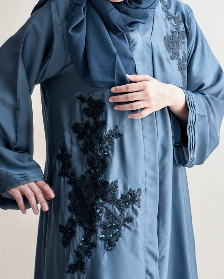 Embrace understated elegance with our plain blue abaya, adorned with delicate sequin appliqué motifs for a subtle touch of glamour. The pleated sleeves add a refined twist to this timeless design, perfect for any occasion.