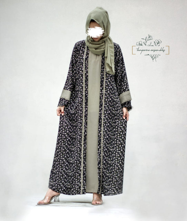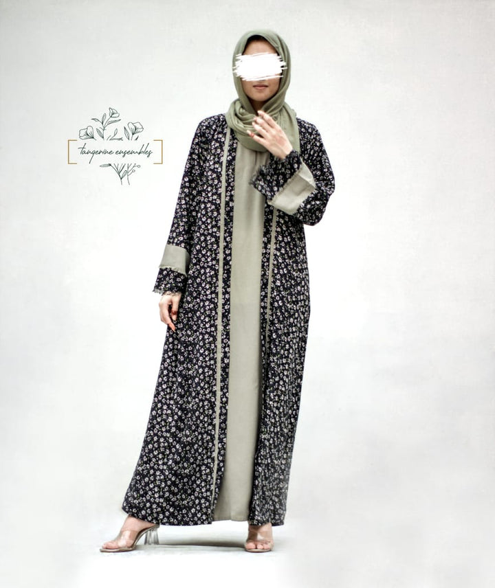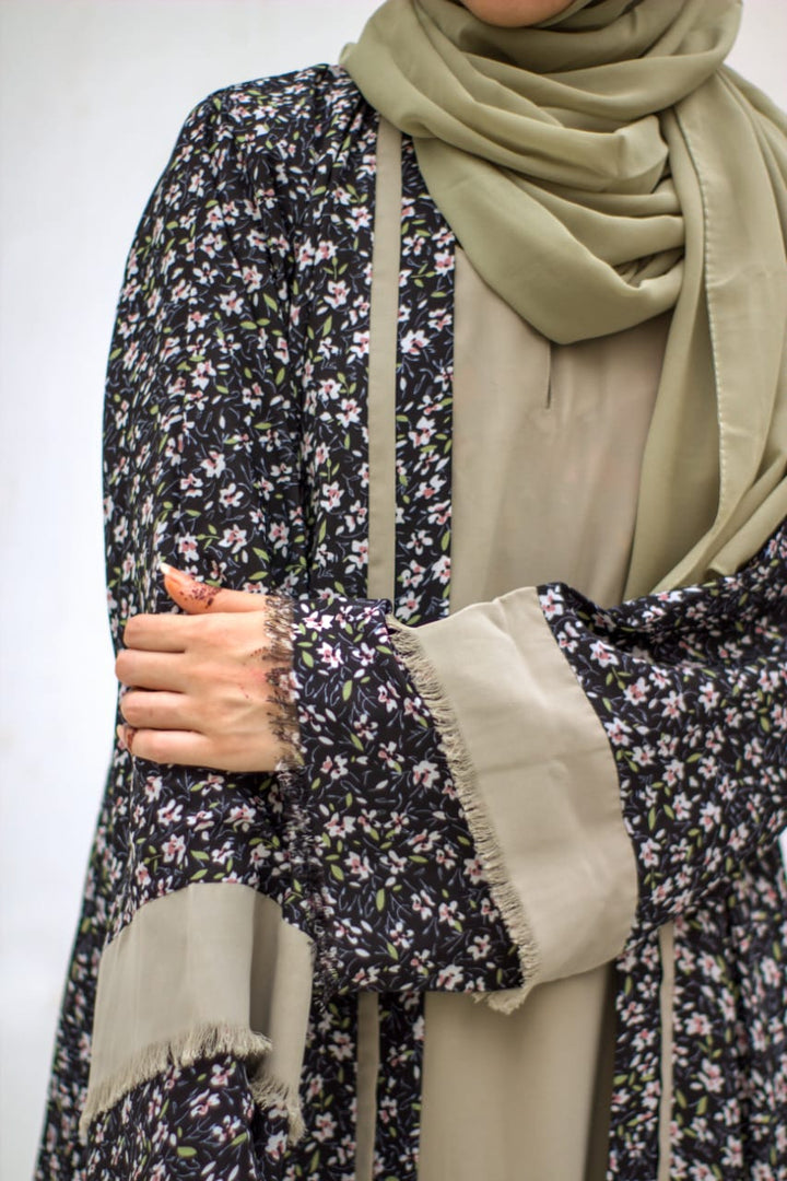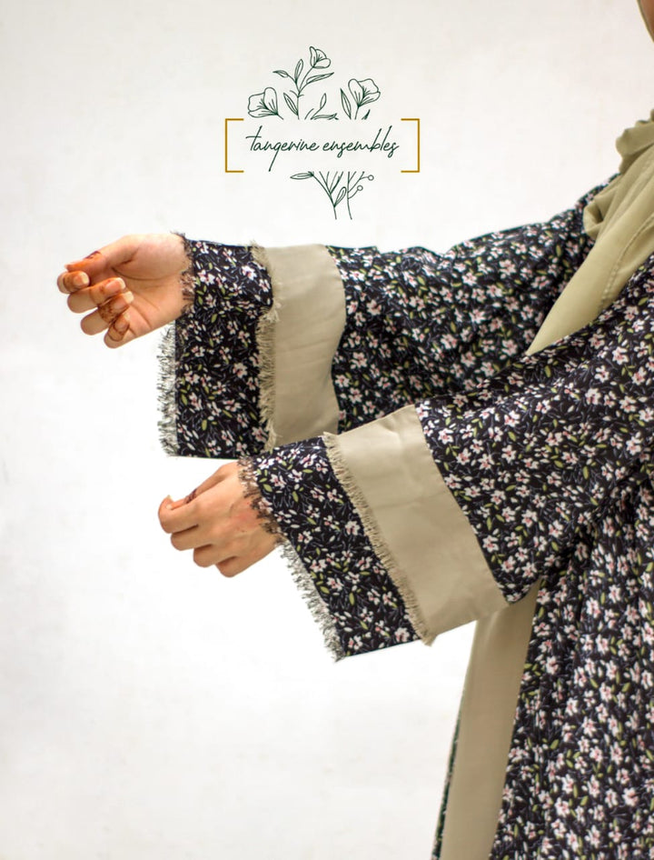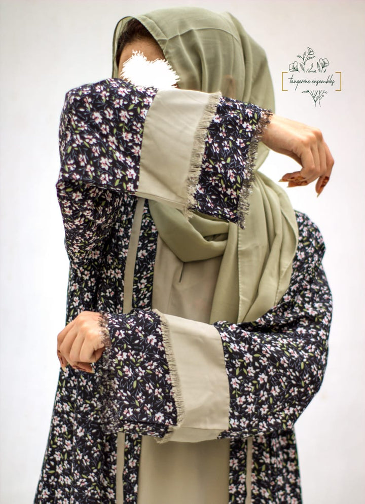 Style meets comfort in this floral black abaya with fringed sleeves and built-in inner. A trendy twist on classic modest wear — breathable, airy, and ultra-flattering.