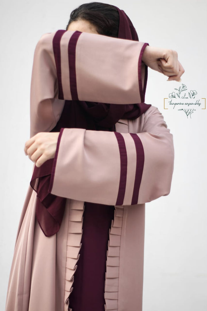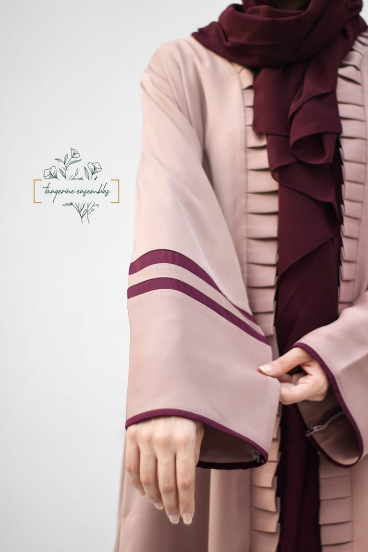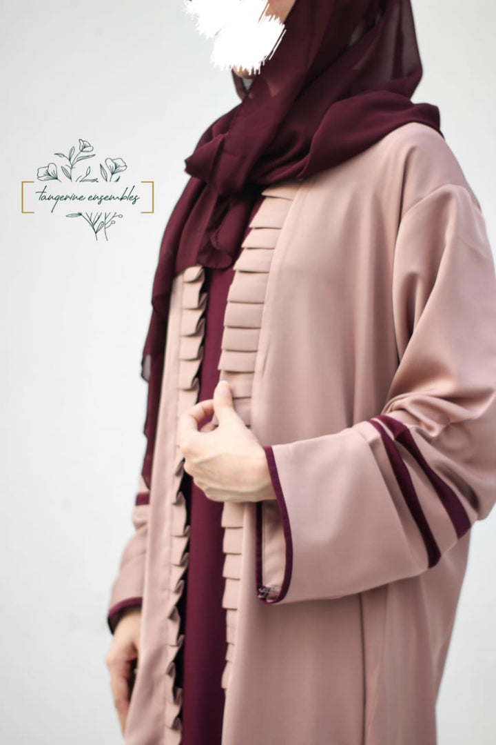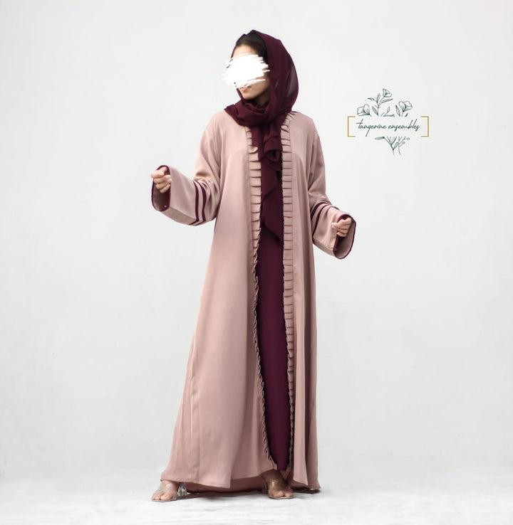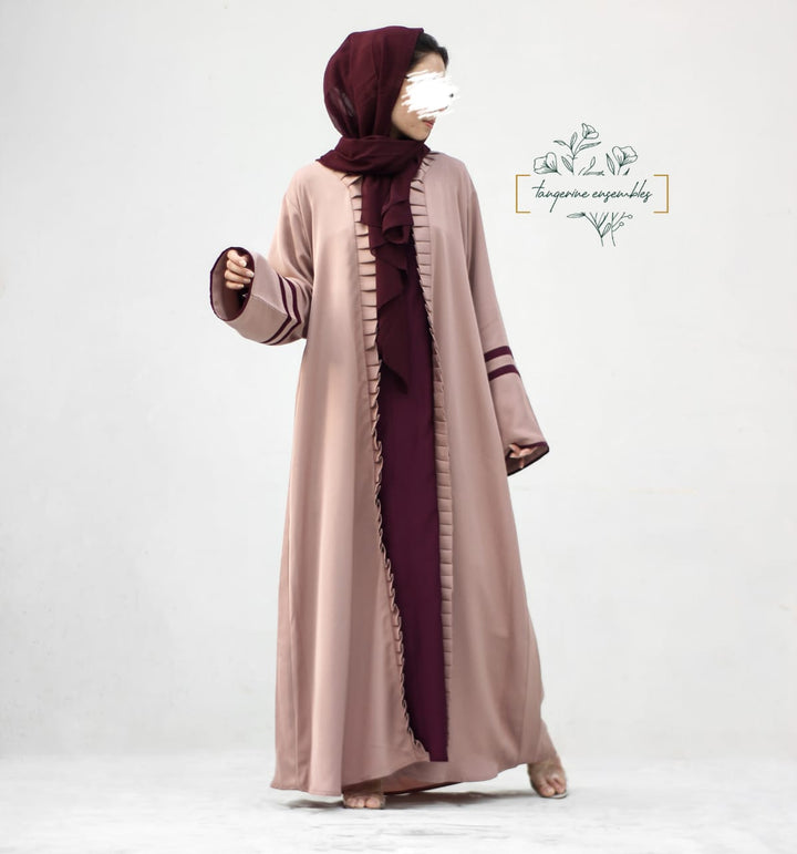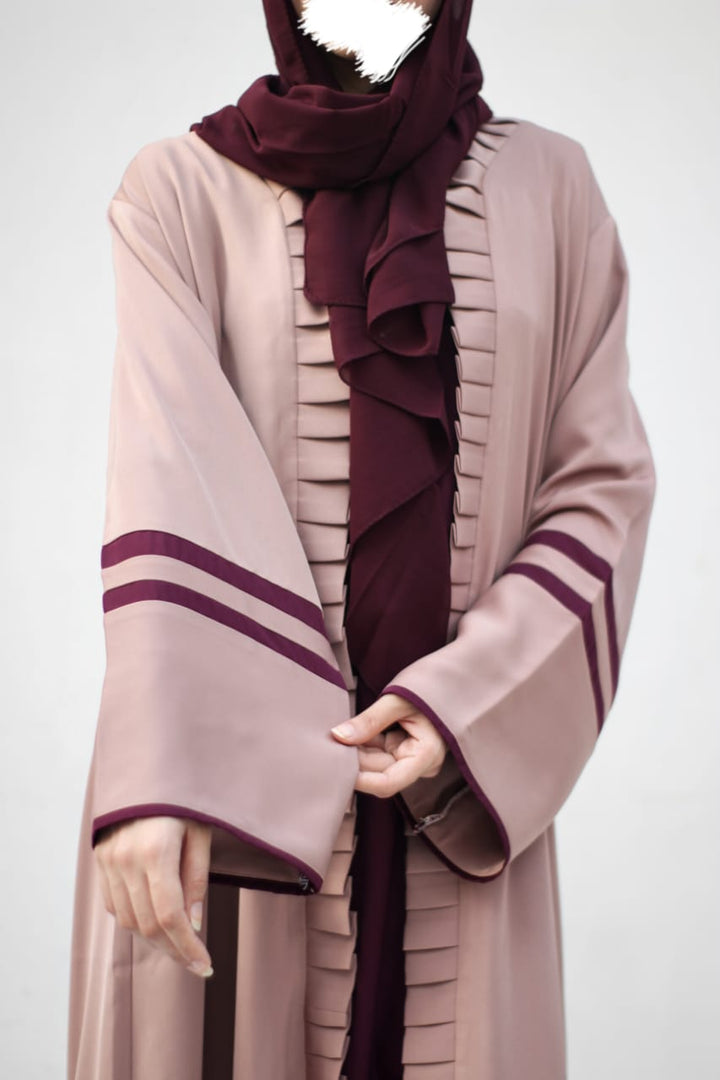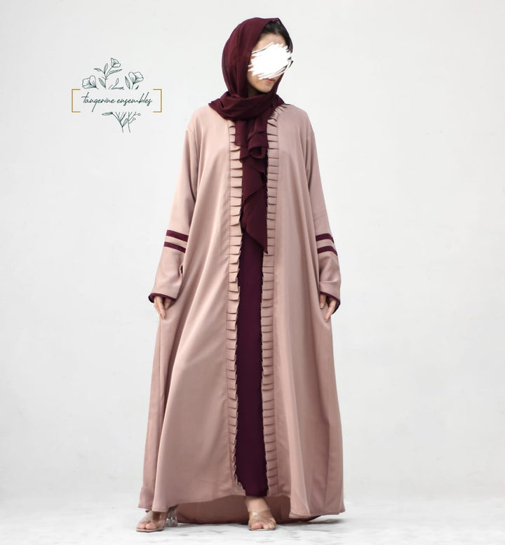 This skin pleated front-open abaya paired with a burgundy attached inner proves that plain can be powerful. Subtle color detailing on the upper adds just the right touch, making it a perfect blend of sober yet stylish. A versatile choice for everyday wear or special gatherings, this modest abaya is designed to keep you graceful and chic at the same time.