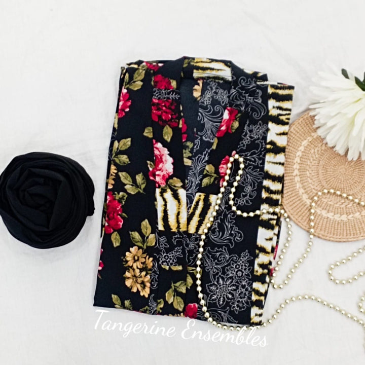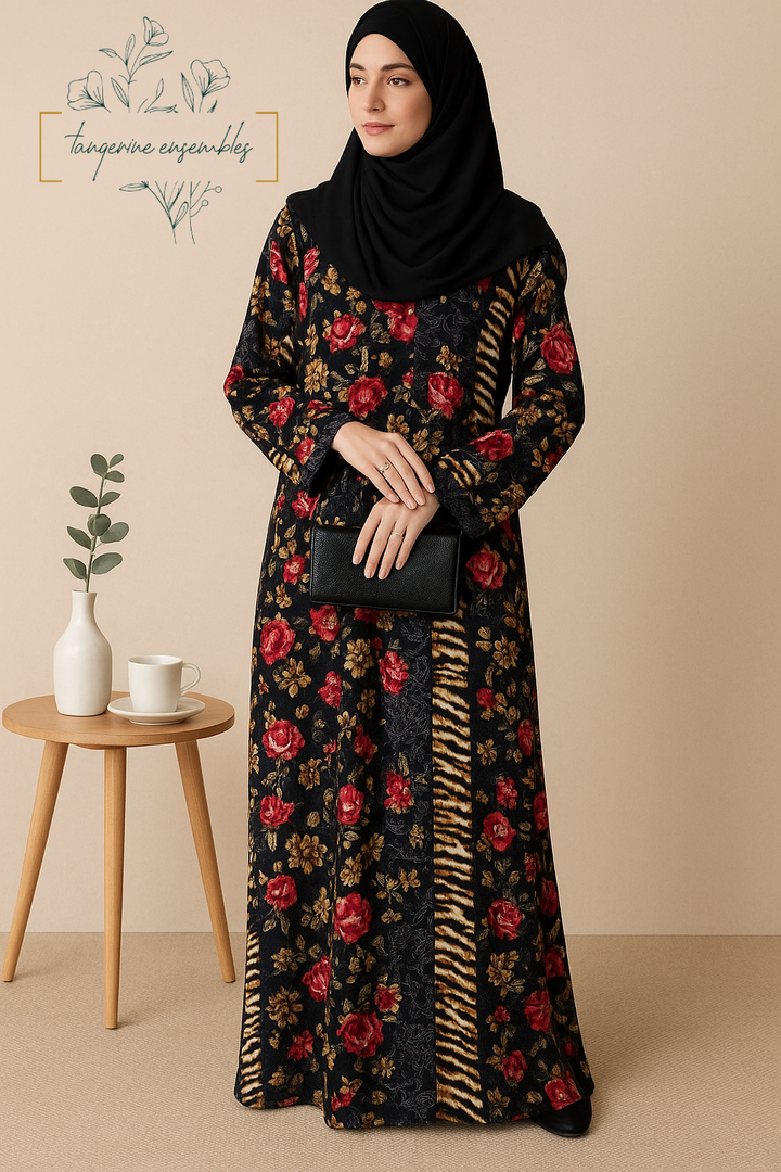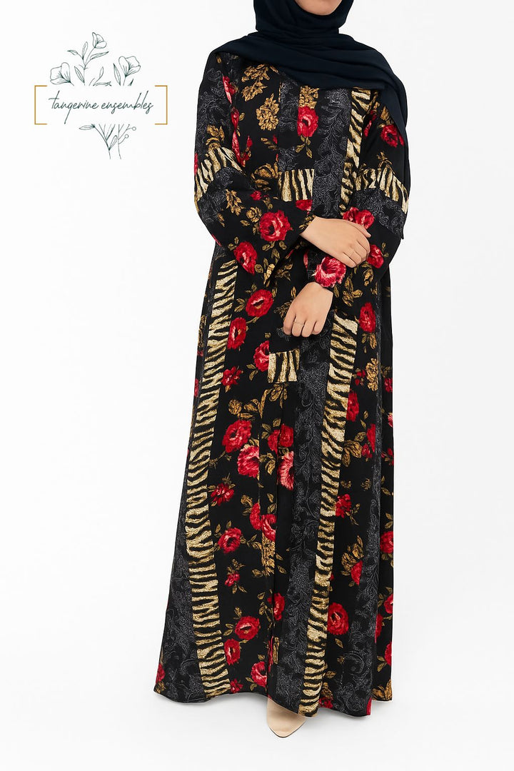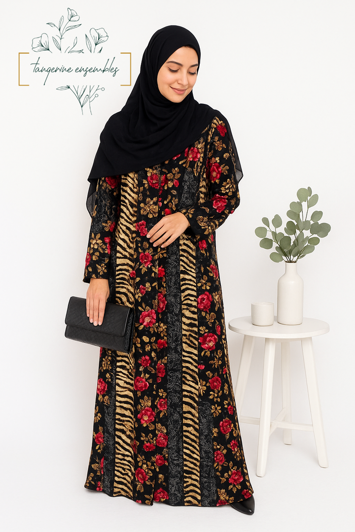 Add a bold and elegant statement to your modest wardrobe with our Rose Safari Abaya. Designed in a striking combination that blends the wild leopard pattern with the romance of roses, with a touch of modern edge. The deep black base beautifully highlights the vibrant red roses and golden accents, making it a standout piece for both casual and semi-formal occasions.