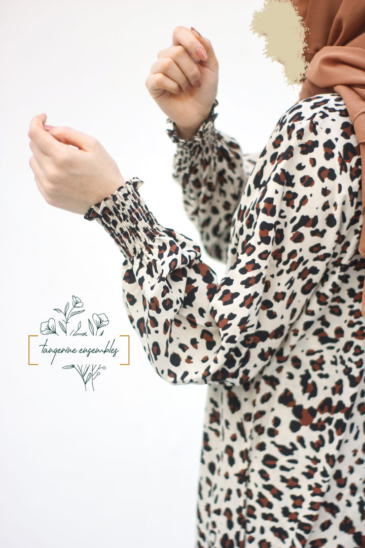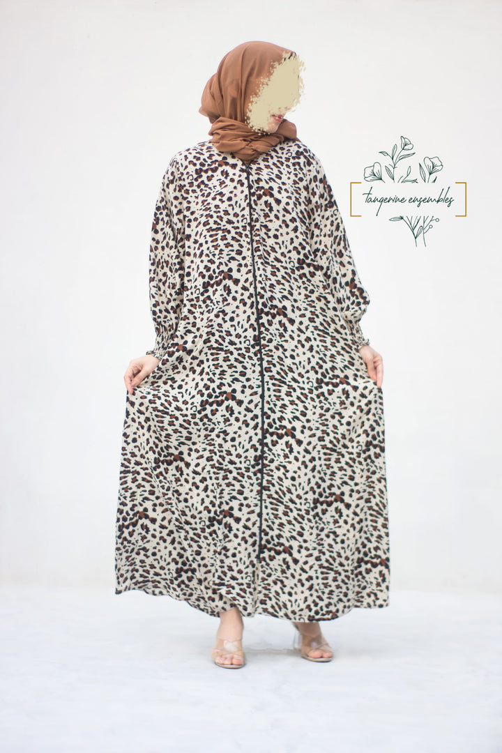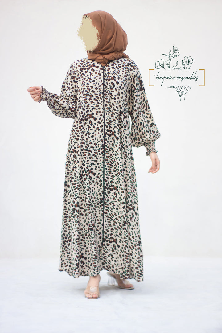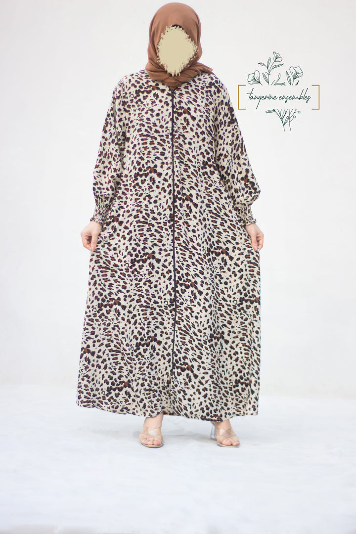 Unleash your wild side with this leopard print abaya! Featuring a convenient front zip, smoking sleeves, and a super-comfy fabric, it’s your ultimate wardrobe essential.