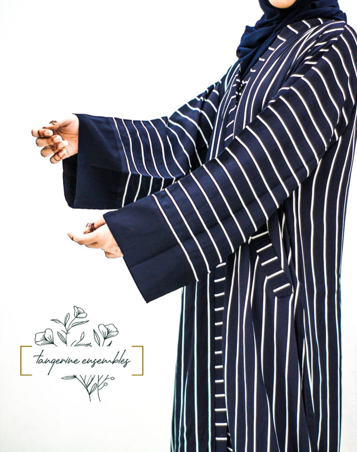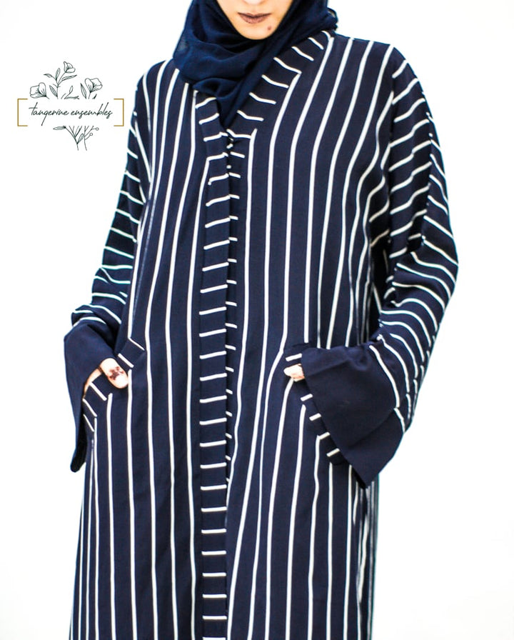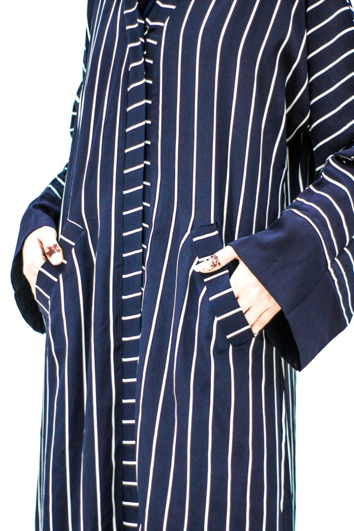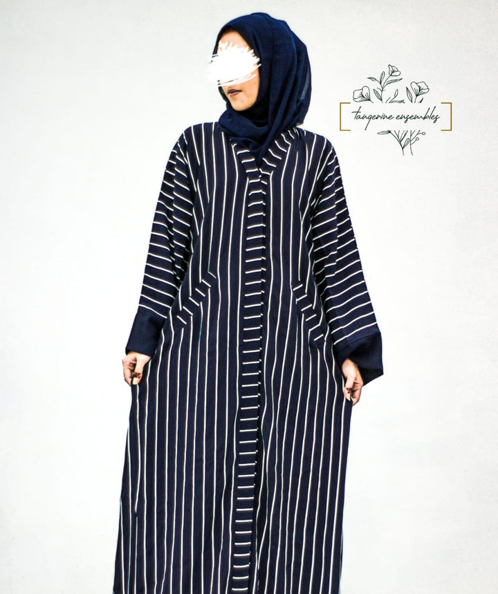 Our Blue Striped Abaya features a sleek plain sleeve strip design, two practical front pockets, and a light, breathable fabric perfect for office wear, daily errands, and even grocery runs.