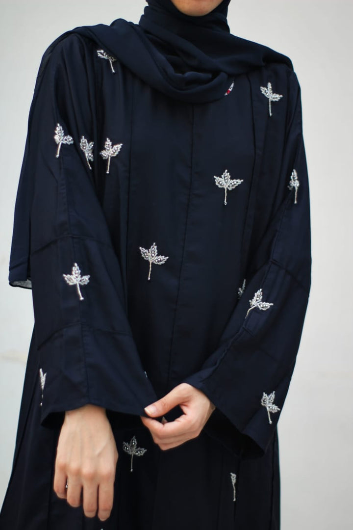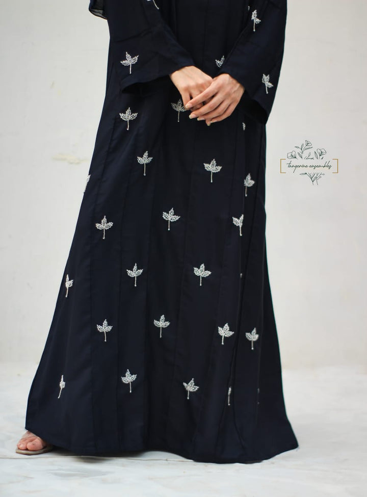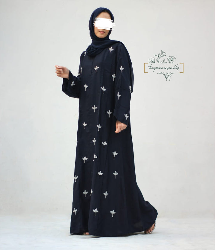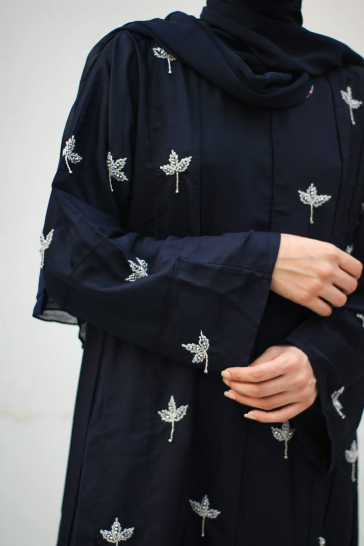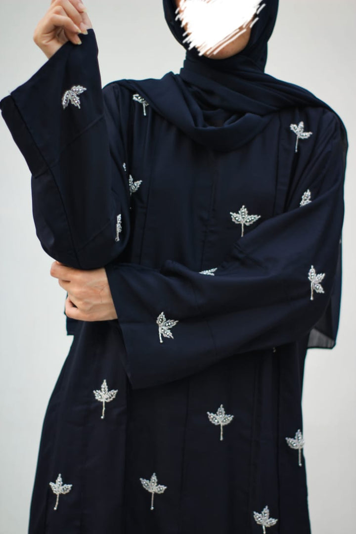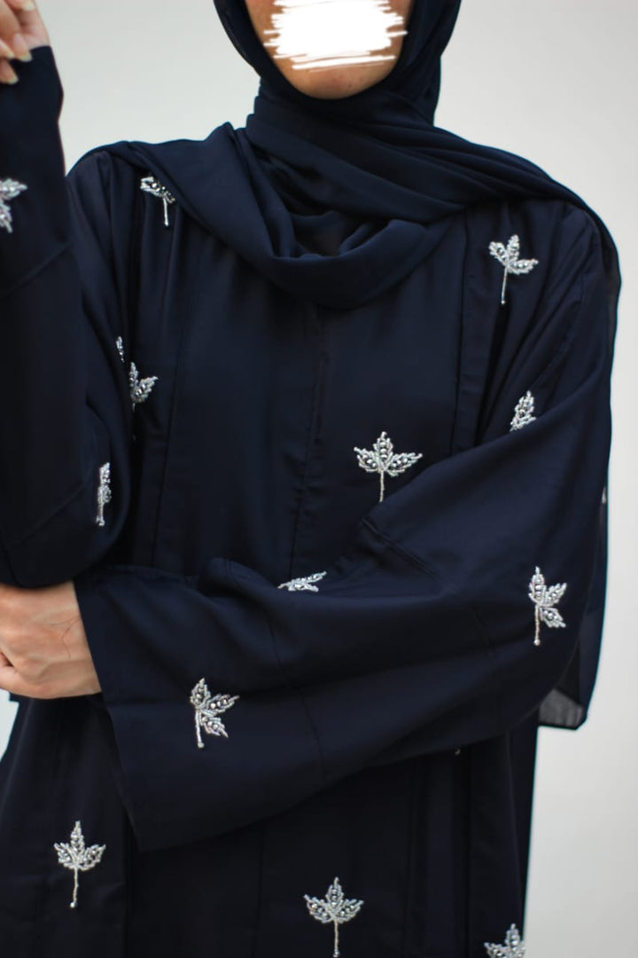 Crafted in premium nada fabric abaya with a soft shine, this luxury formal abaya features intricate handwork silver motifs with delicate droplet embellishments. Designed with pintux all over, it carries a royal charm – making it the perfect wedding abaya, evening abaya, or formal wear abaya for your special occasions.