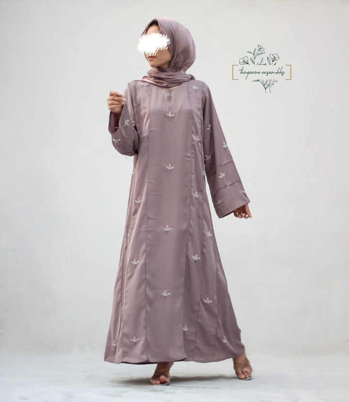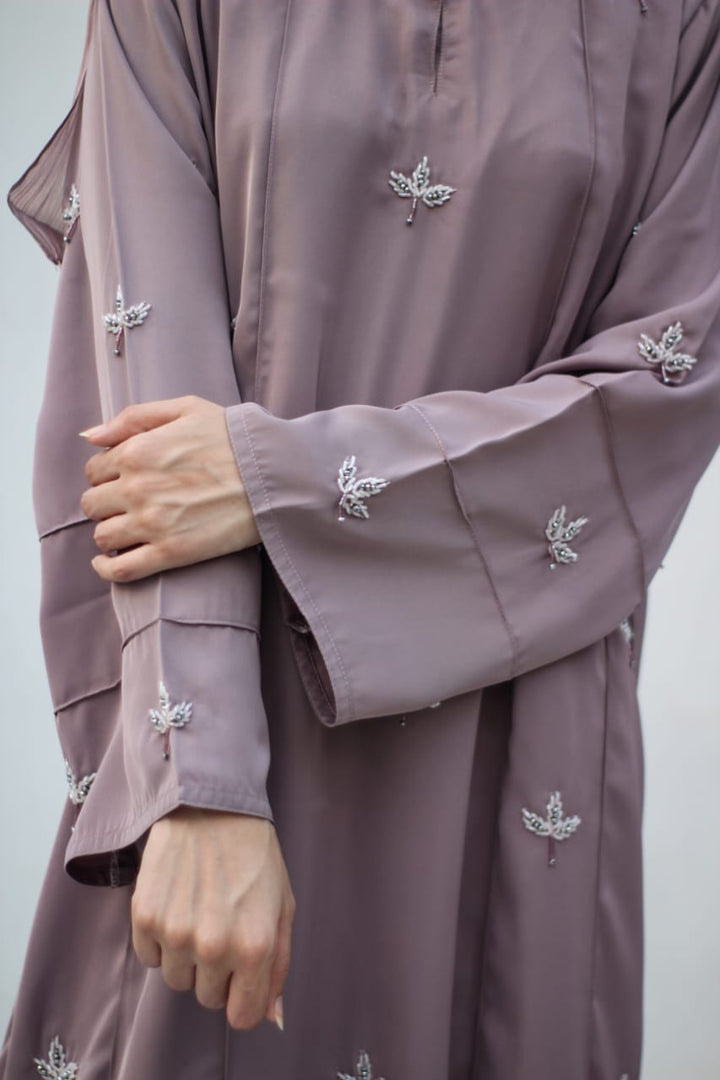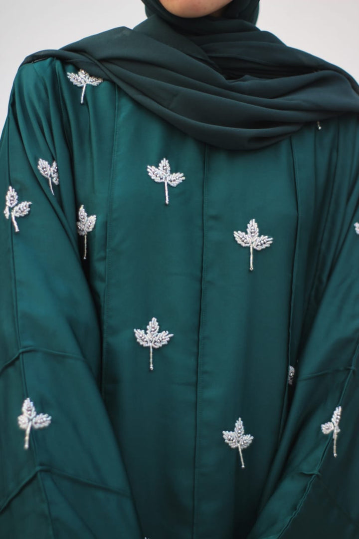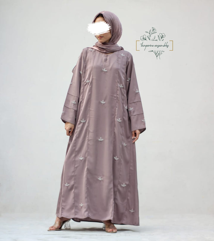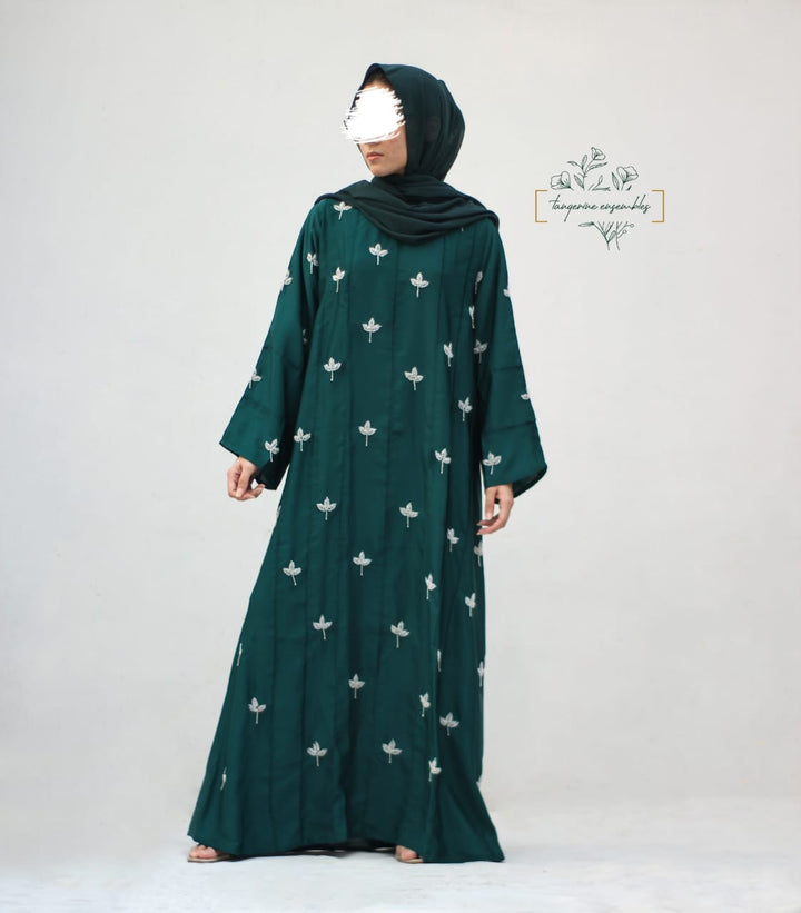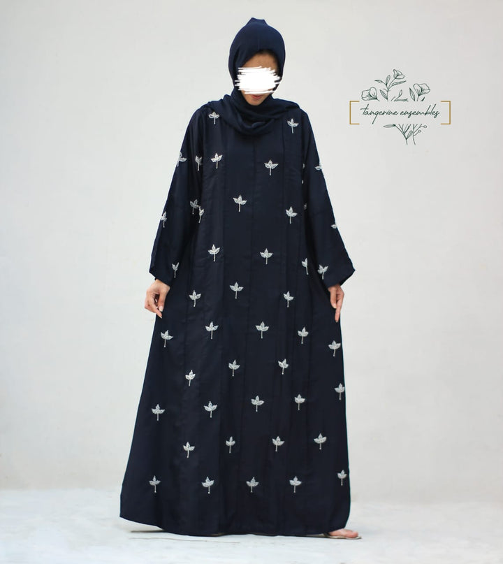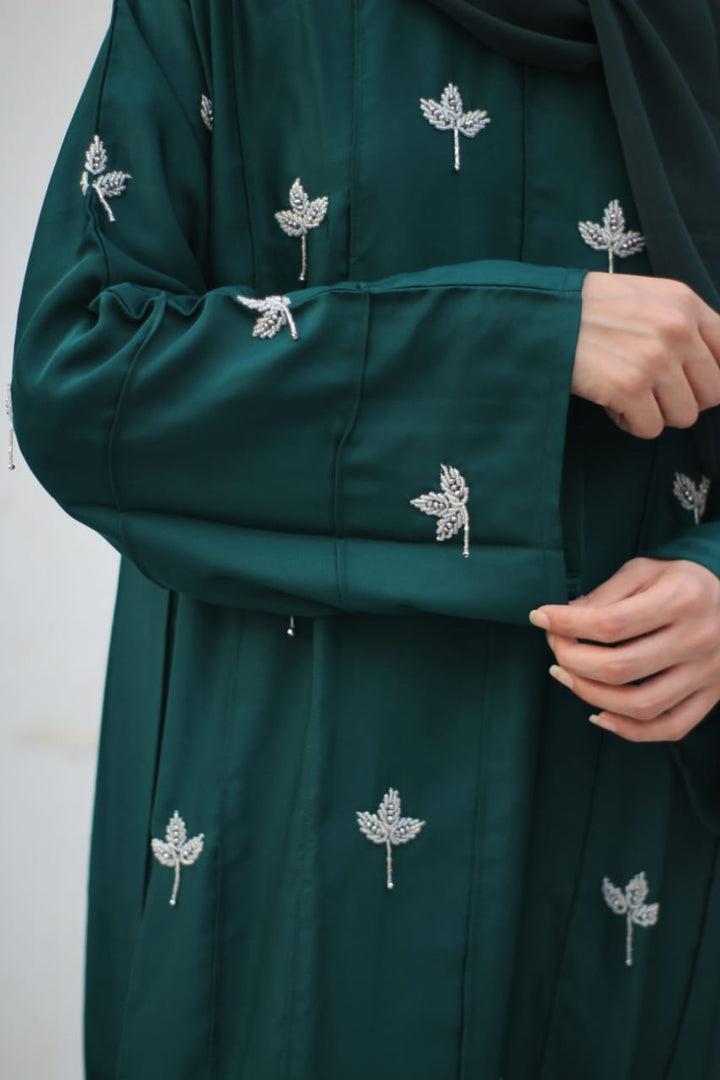 Crafted in premium nada fabric abaya with a soft shine, this luxury formal abaya features intricate handwork silver motifs with delicate droplet embellishments. Designed with pintux all over, it carries a royal charm – making it the perfect wedding abaya, evening abaya, or formal wear abaya for your special occasions.