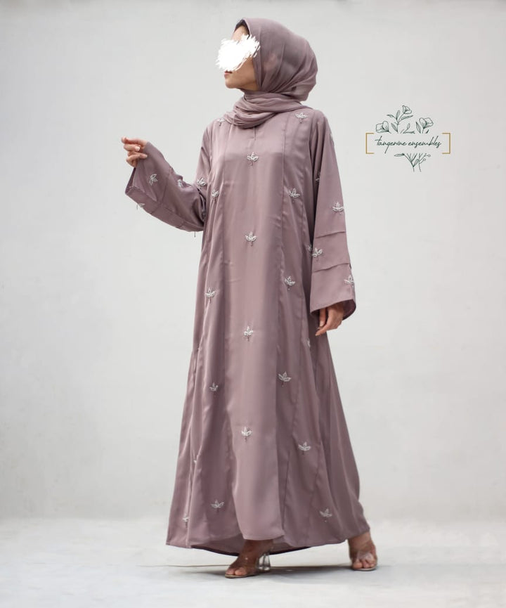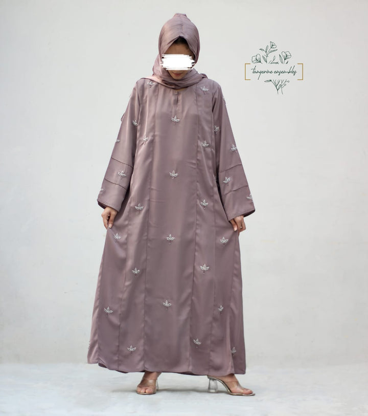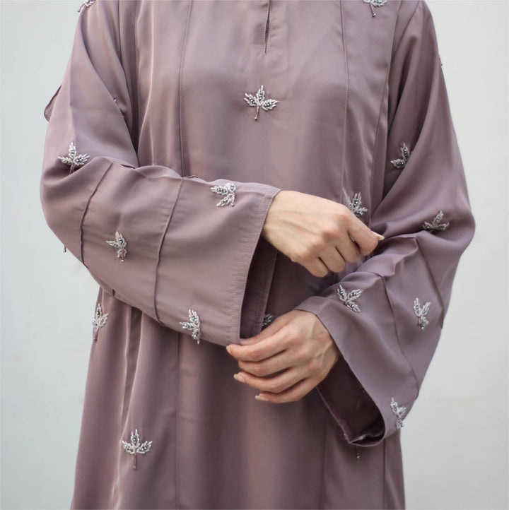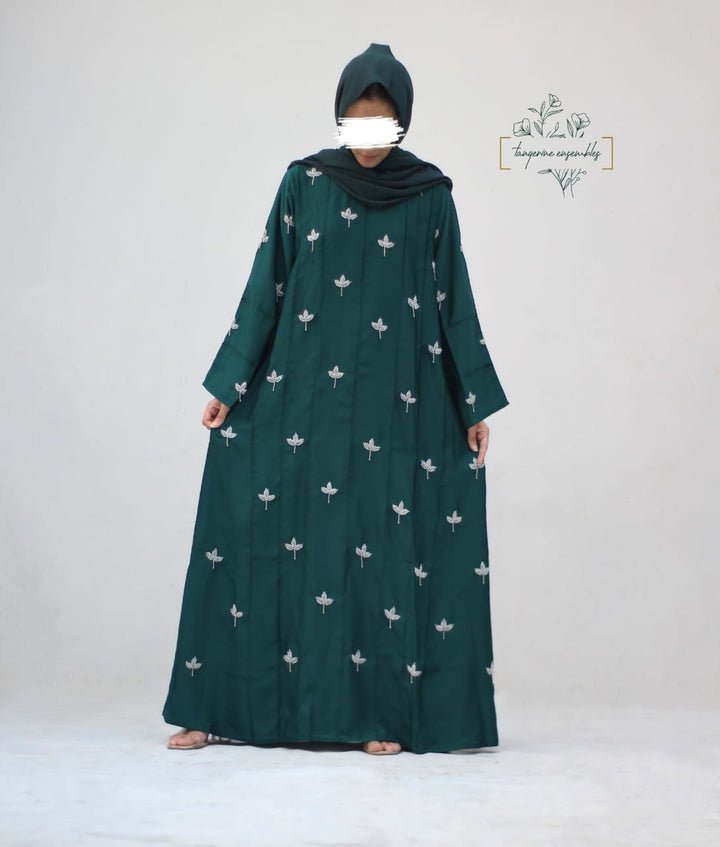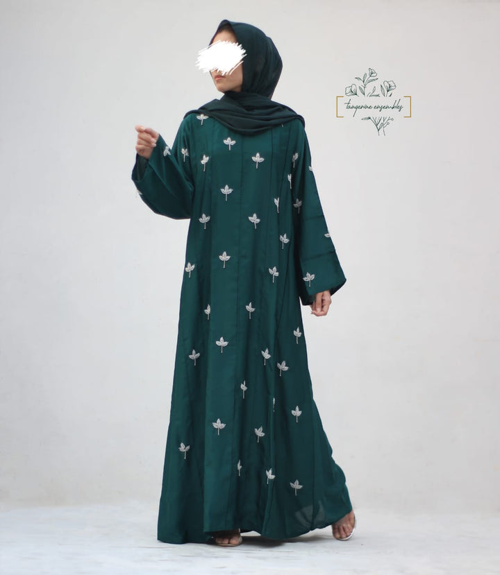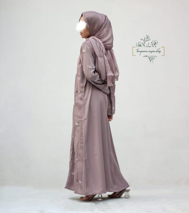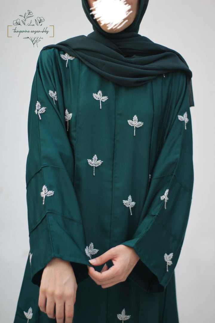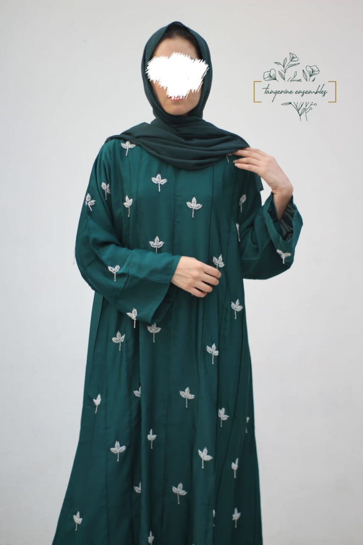Crafted in premium nada fabric abaya with a soft shine, this luxury formal abaya features intricate handwork silver motifs with delicate droplet embellishments. Designed with pintux all over, it carries a royal charm – making it the perfect wedding abaya, evening abaya, or formal wear abaya for your special occasions.