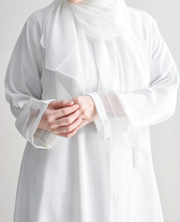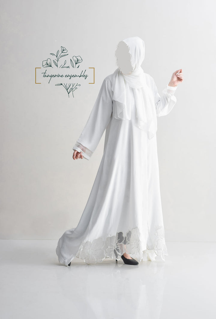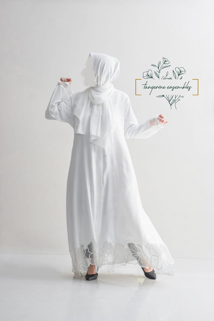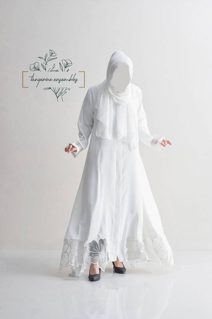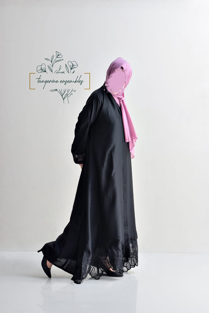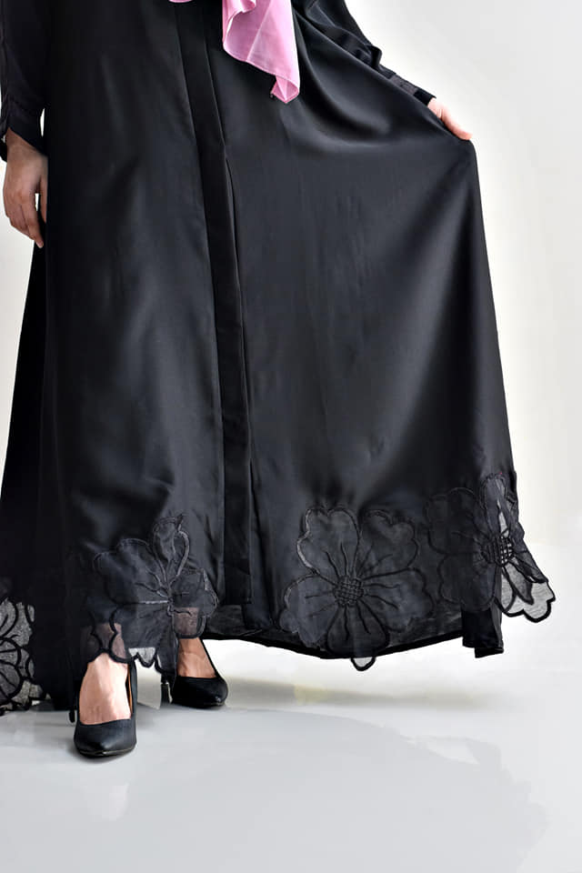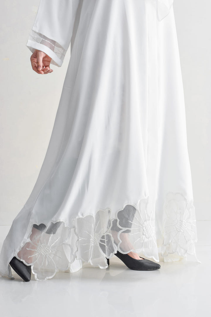 Elegance redefined with our stunning abaya featuring intricate floral cutwork on the hem and delicate organza details on the sleeves. Available in timeless black and white, crafted from ultra-soft nada fabric, it's the perfect choice for your next formal gathering.