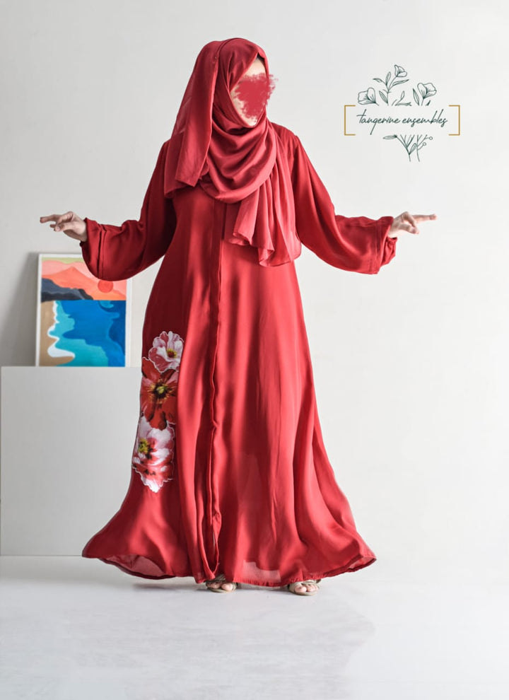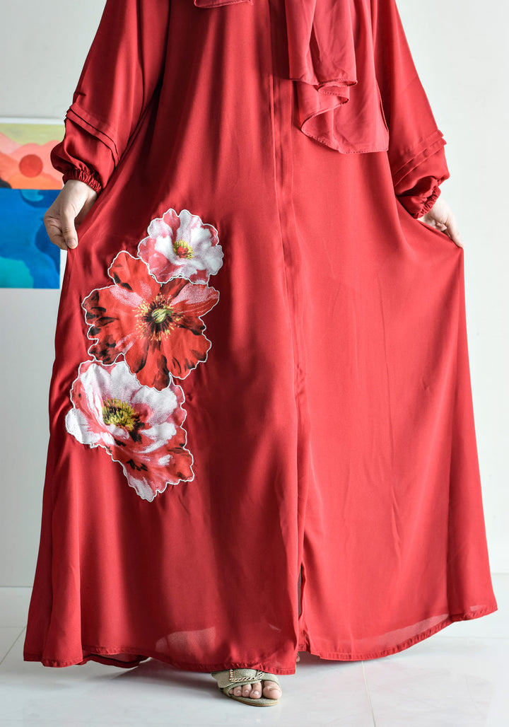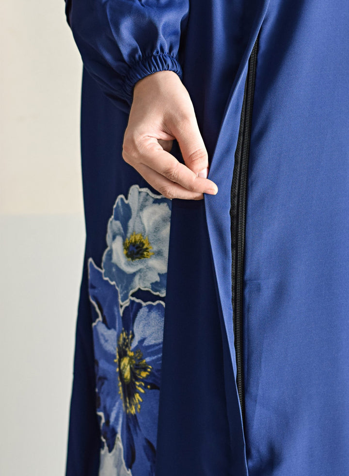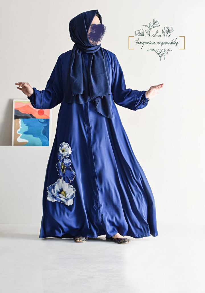 Zip up sophistication with a botanical twist – a captivating zipper abaya featuring artisanal flower appliqué details and convenient side pockets…..
